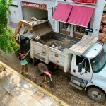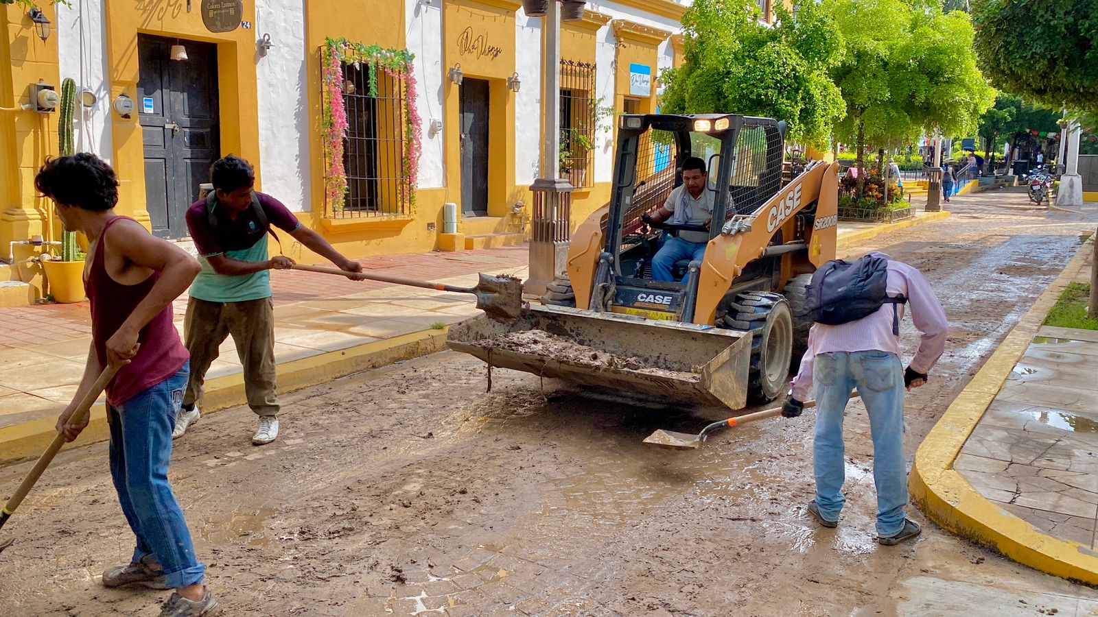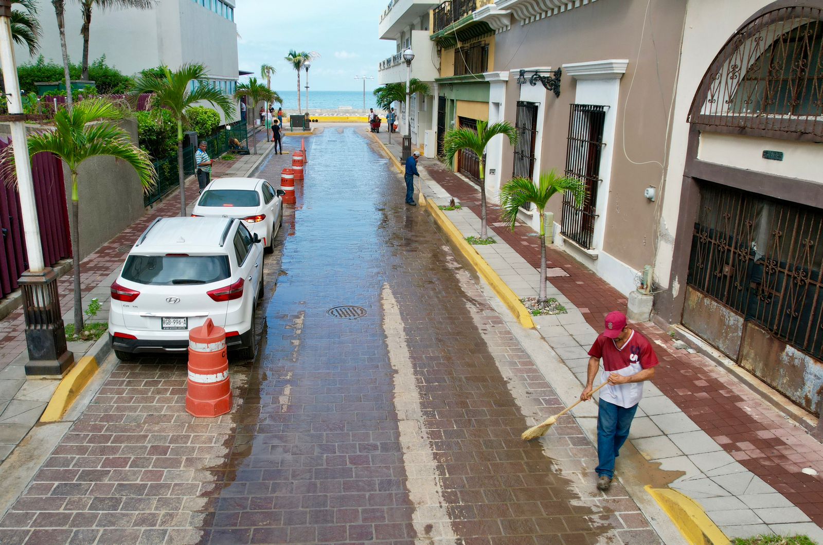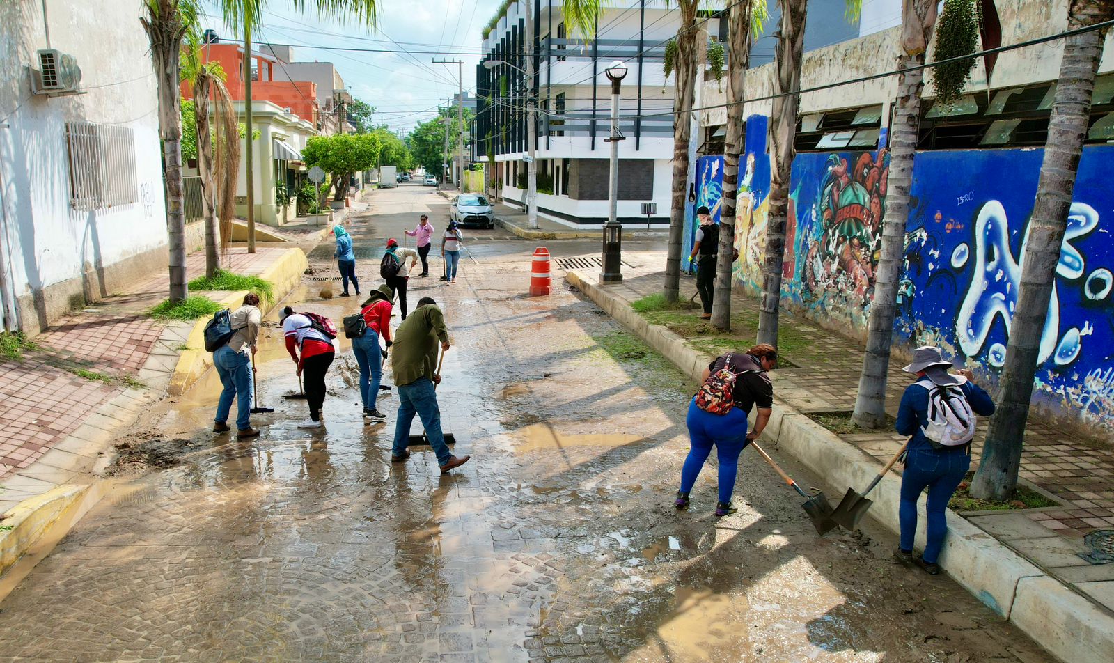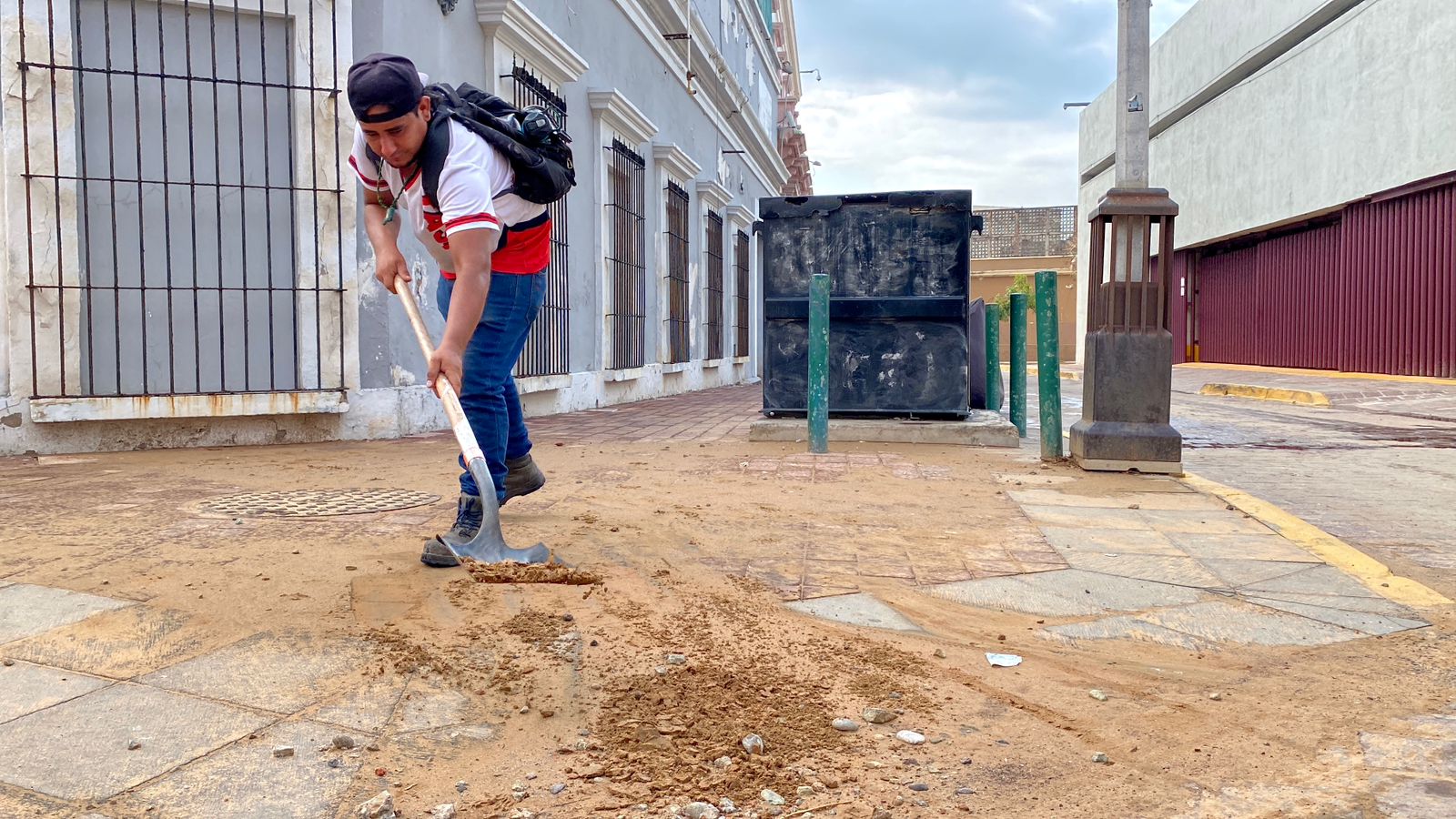 Mazatlán, Sinaloa, 12 de septiembre de 2023.- Cuadrillas de la Dirección de Servicios Públicos llevan a cabo intensas labores de limpieza en calles del centro histórico de la ciudad para retirar la tierra excedente que arrastró la intensa precipitación de la semana pasada.