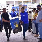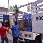 En el patio del Ayuntamiento se realizó la tercera entrega de los equipos, y cubetas de pintura, a maestros de las instituciones educativas que fueron beneficiadas con esta acción, a través del Programa Peso a Peso.