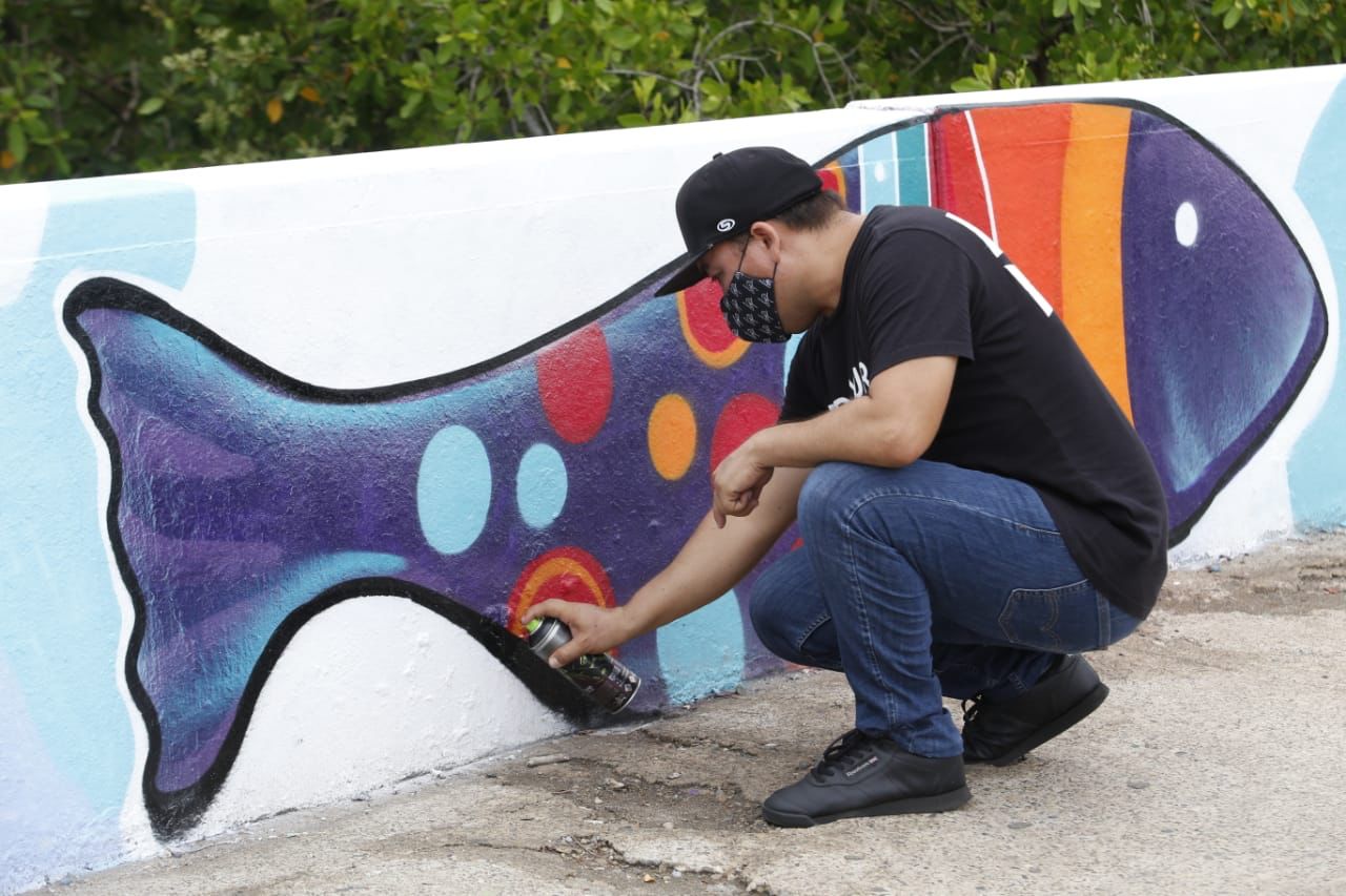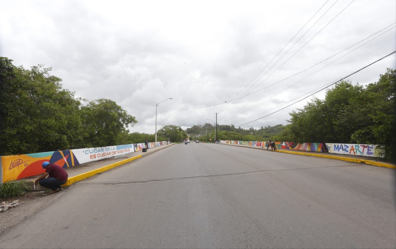 Mazatlán.- El puente del Estero Infiernillo fue embellecido por el artista mazatleco Carlos Loaiza, invitado por el Instituto Municipal de la Juventud con el fin de lograr un acercamiento con todos los jóvenes que tienen inclinaciones artísticas, en especial por el graffiti.