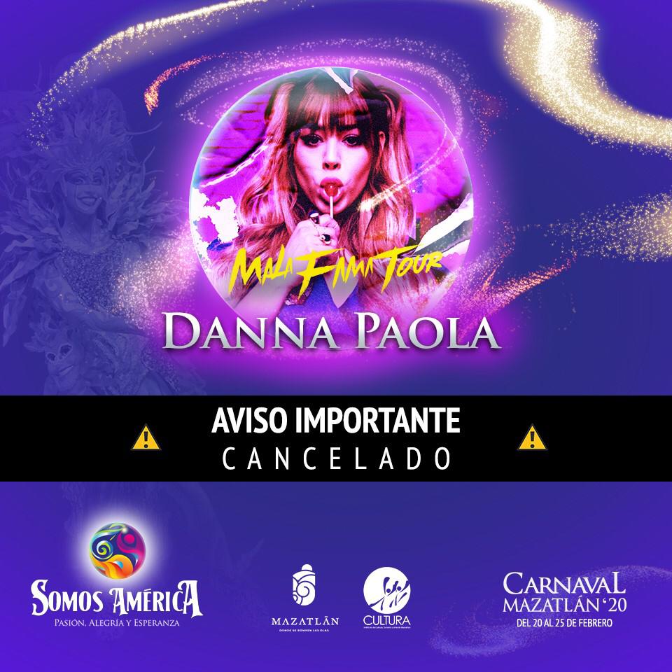 Mazatlán, Sinaloa.- Debido a la cancelación del concierto de la artista internacional Danna Paola, programada para el martes 25 de febrero en Olas Altas en el Carnaval Internacional de Mazatlán 2020, «Somos América, Pasión, Alegría y Esperanza», el Instituto Municipal de Cultura, Turismo y Arte actuará conforme a derecho tras los daños y perjuicios que se generó ante el incumplimiento de contrato.
