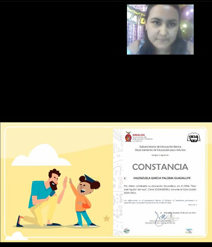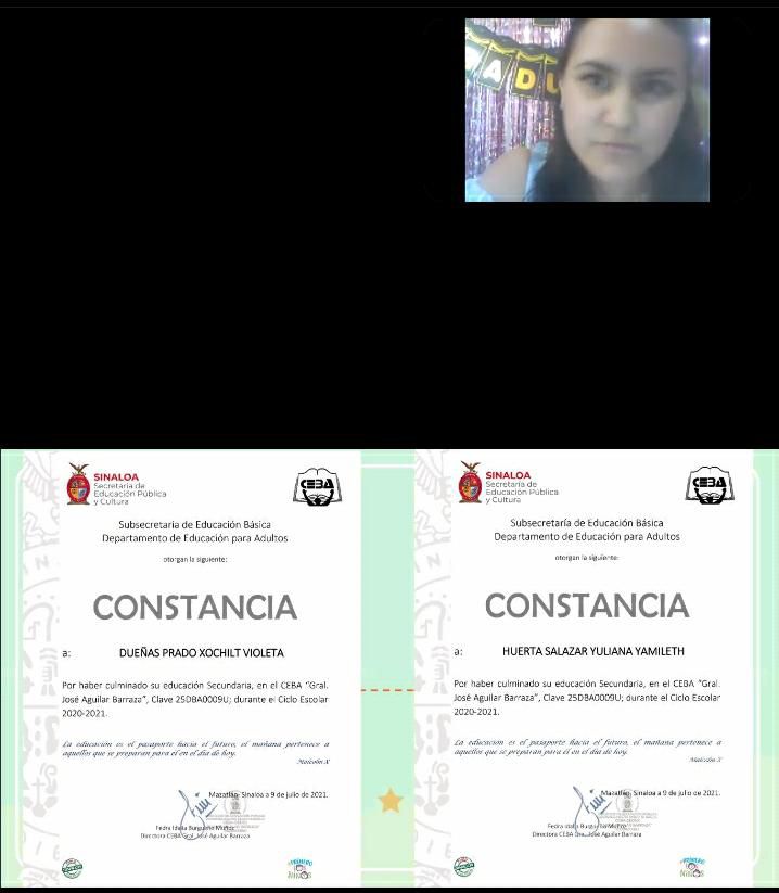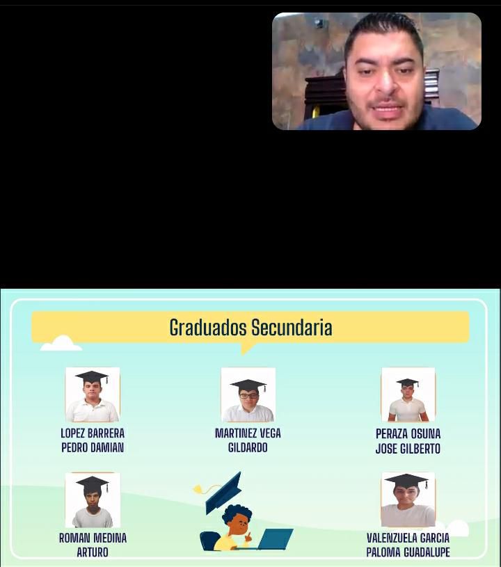 En la graduación virtual de los 15 alumnos del CEBA estuvieron presentes el Supervisor de Educación Básica para Adultos en la Zona Sur de Sinaloa, José Luis Sánchez Torrero; la directora del Centro, Fedra Idalia Burgueño Muñoz; la planta docente conformada por Maritza Orinsky Mederos y Hugo Burgueño Muñoz; así como la encargada de la Casa Hogar, Perla María Ayvar Puga y la representante de Bienestar Social, Yaritza Villalobos.