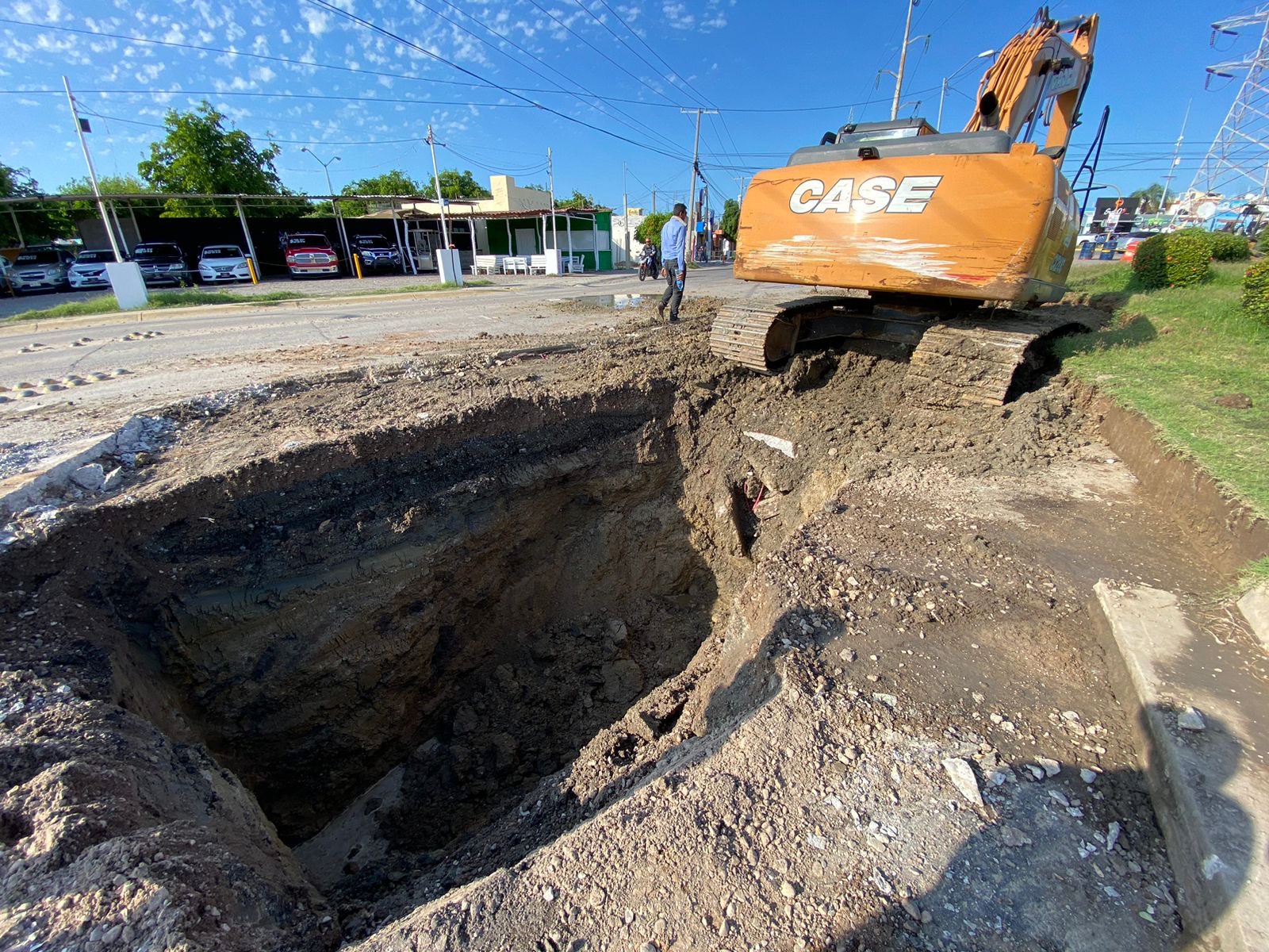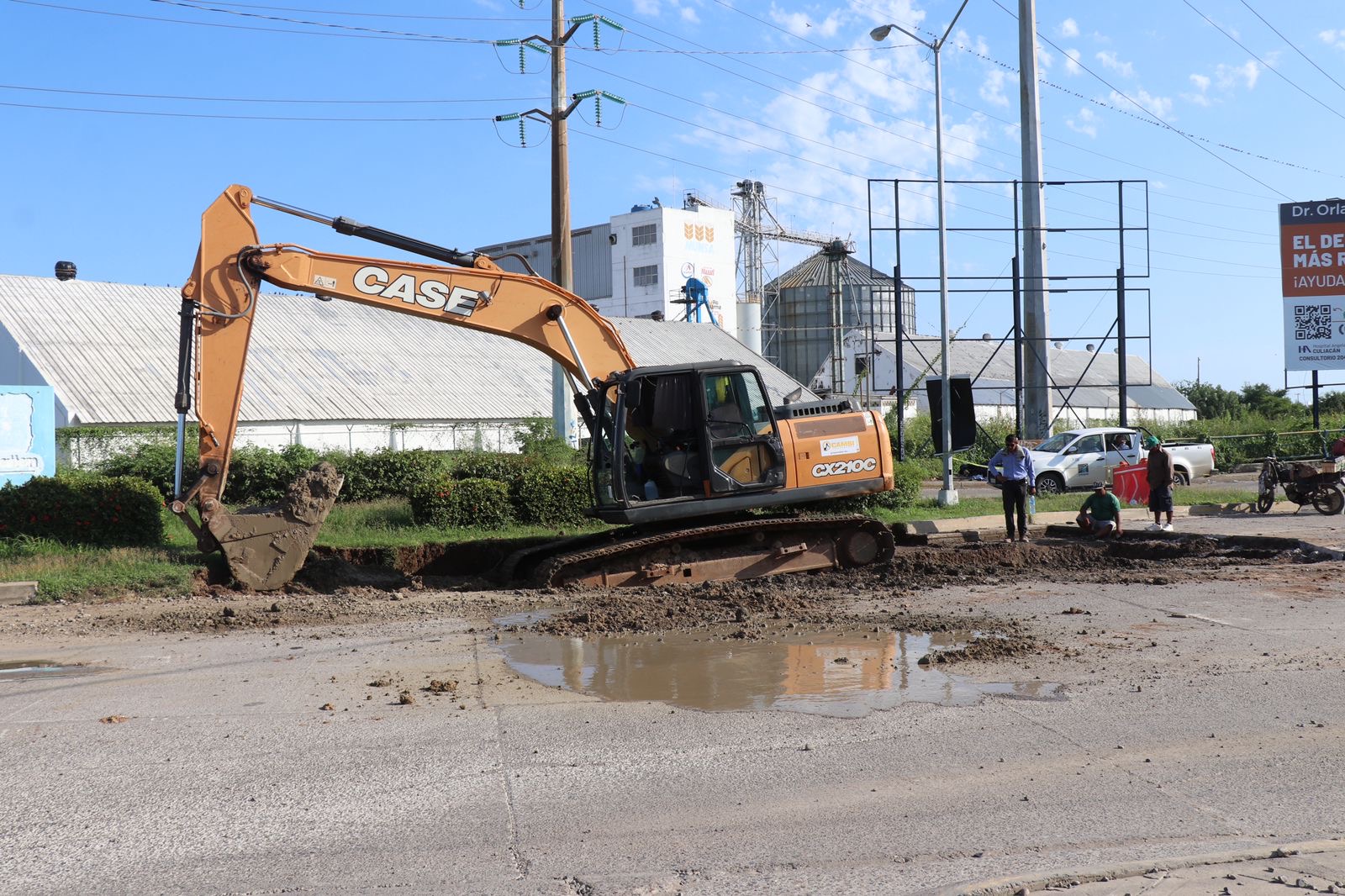 Es importante precisar dicho este socavón, que está frente al molino harinero, es por causa el colapso del colector, que a su vez está generando el derrame de aguas residuales a la altura del crucero de la Avenida Las Torres y la Carretera Internacional al Norte, mismo que irá reduciéndose a medida que empiece a funcionar la nueva tubería.
