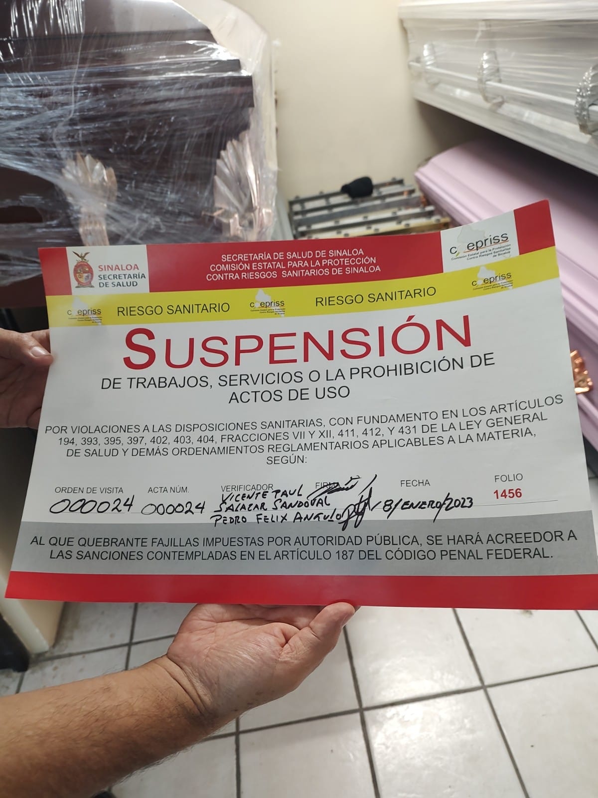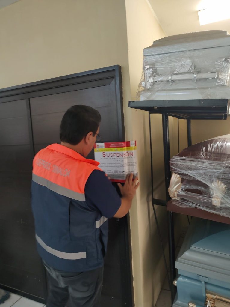 El Ing. Randy Ross Álvarez, Comisionado Estatal para la Protección Contra Riesgos Sanitarios de Sinaloa, dio a conocer que se llegó a la funeraria (de la cual se omite nombre por encontrarse en proceso administrativo abierto) la tarde de este martes para verificar señalamientos que en redes sociales y a través de diferentes medios, se hicieron públicos, encontrando que incumplía diversas disposiciones sanitarias por se procedió a la clausura parcial por tiempo indefinido.