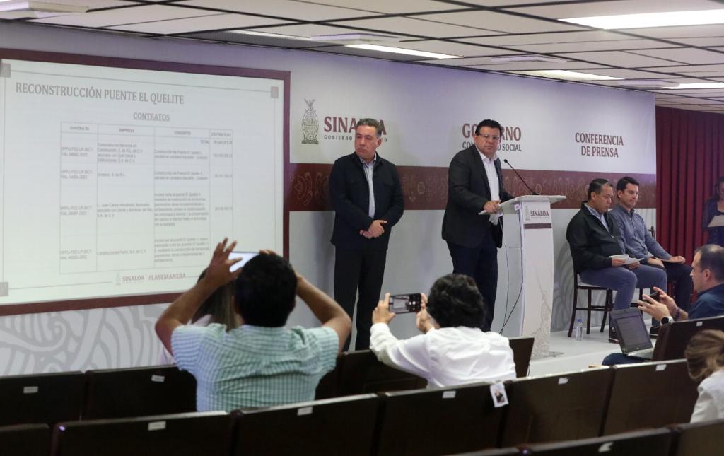 El secretario de Obras recordó que el puente original El Quelite fue derrumbado por la creciente del río que provocó el huracán “Nora” en septiembre del 2021, y en abril de 2022 el Gobierno Federal formalizó un convenio de asignación de recursos para que fuera el Gobierno del Estado el que convocara a licitación, la cual fue adjudicada a cuatro empresas distintas que se encargan de construir cada una un tramo de puente, cuya longitud es de casi un kilómetro en total en sus dos cuerpos.