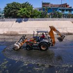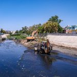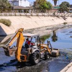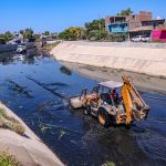 La maquinaria retira la maleza crecida y basura de todo tipo que pudieran causar taponamientos e inundaciones en los asentamientos aledaños al cuerpo de agua.