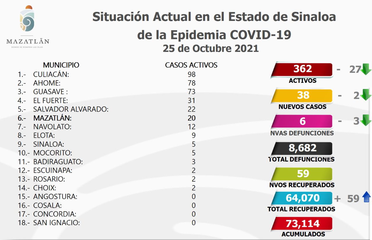 Mazatlán.- Este martes, la ciudad amaneció con solo 20 casos activos de Covid-19, luego de que en plataforma se registraron la noche del lunes 2 nuevos pacientes, seis recuperados y ninguna defunción, informó Cristian Castillo López, encargado de Protocolos y Sanidad del Municipio.