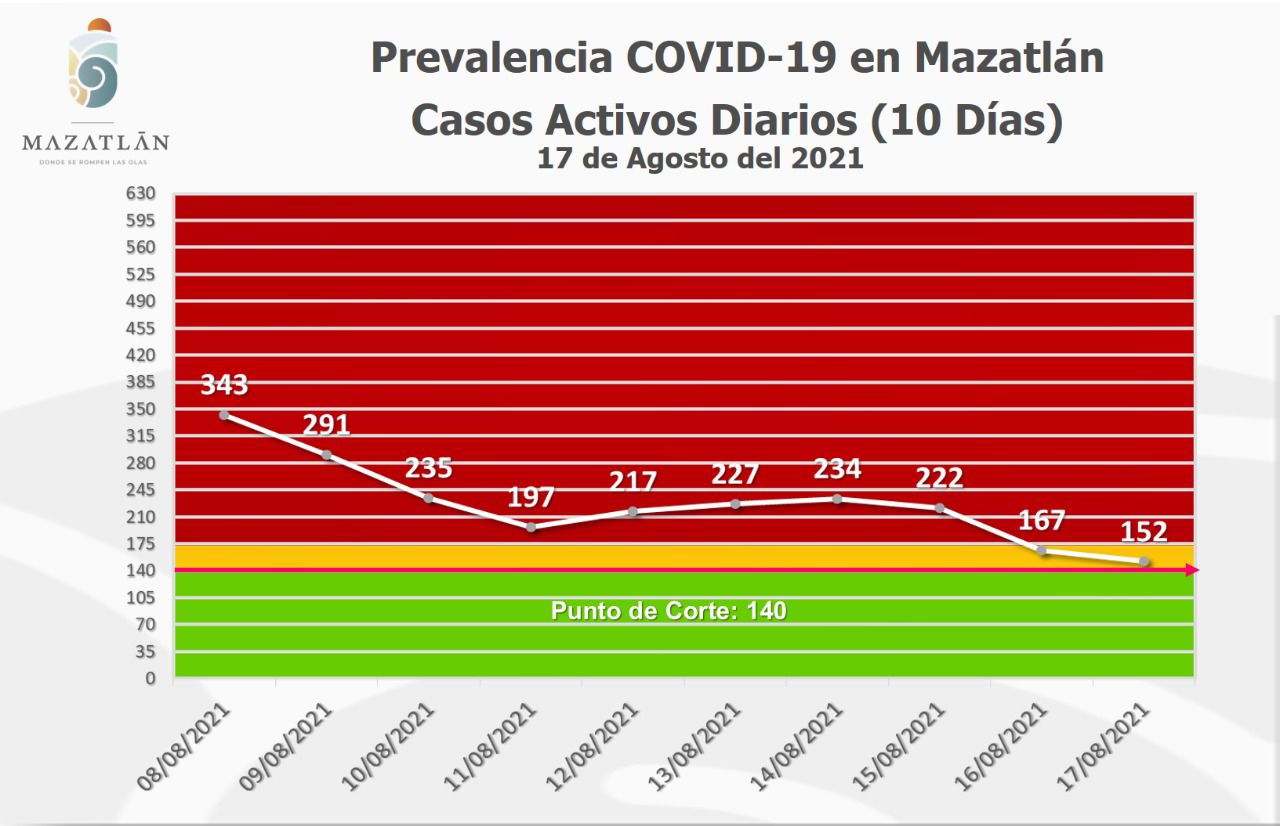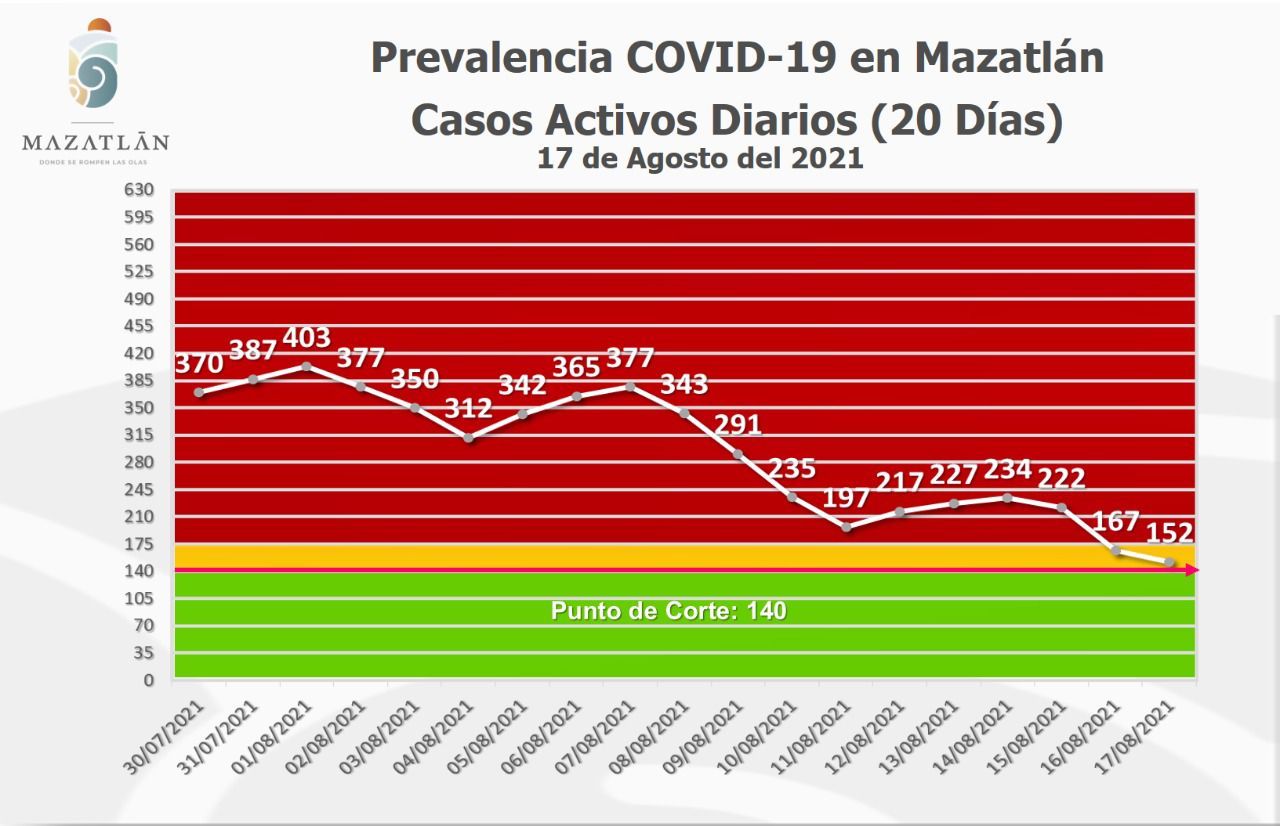 Mazatlán.- La tendencia favorable a la baja en los casos activos de Covid-19 se mantiene por tercer día consecutivo y este miércoles el puerto amaneció con 152 pacientes del virus Sars-Cov-2, aseguró Cristian Castillo López, encargado de Protocolos y Sanidad del Ayuntamiento.