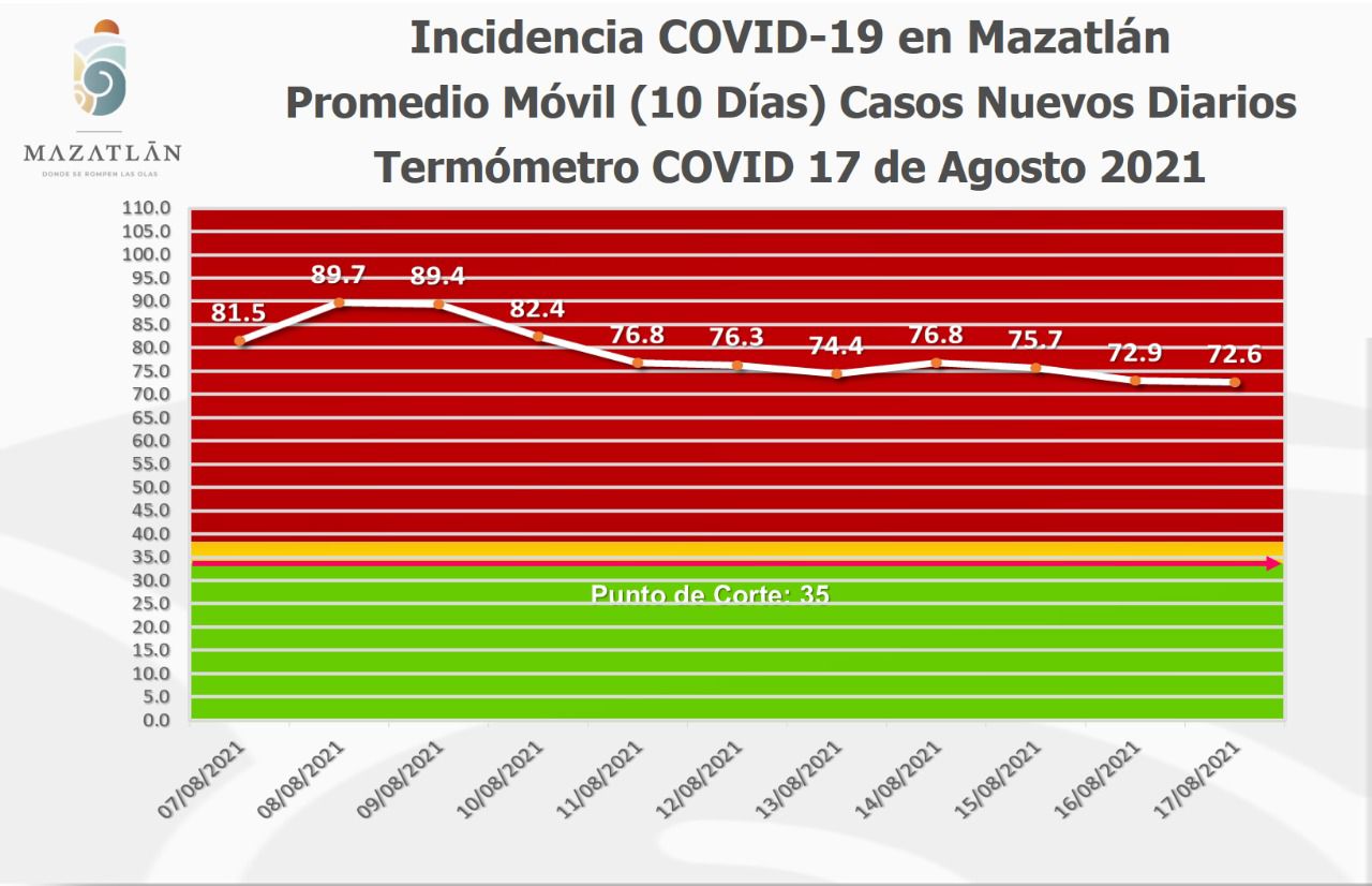 Castillo López destacó que también el Termómetro Covid del Gobierno Municipal tiene tres días a la baja y se ubicó en 72.6 grados, pero se mantiene en color rojo.
