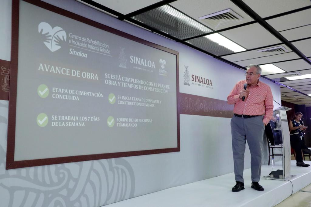 Culiacán, Sinaloa, a 29 de Mayo de 2023.- Enfatizando el valor simbólico de esta obra, que representa la generosidad de las personas que apoyaron para iniciar su construcción, esta mañana el Gobernador Rubén Rocha Moya reiteró durante su Conferencia Semanera el compromiso de inaugurar el Centro de Rehabilitación e Inclusión Infantil Teletón Mazatlán el próximo mes de noviembre, tal como se tiene previsto desde la colocación de la primera piedra el pasado mes de marzo.