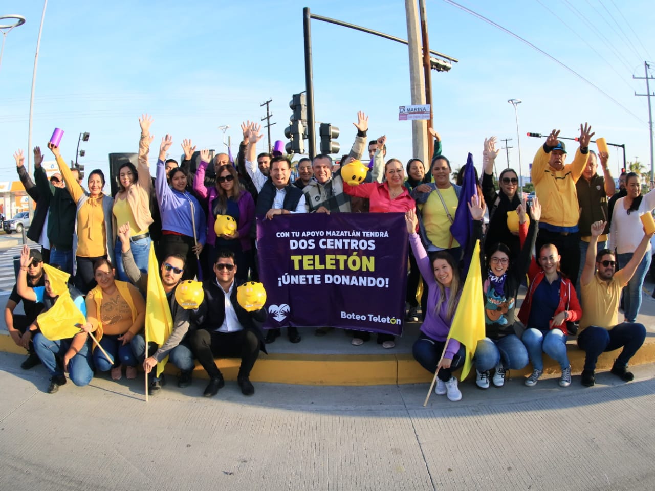 Mazatlán, Sinaloa a 16 de diciembre del 2022.- Con el corazón amarillo y morado, símbolo del Teletón 2022, personal de diferentes área del Gobierno Municipal que encabeza el Alcalde Edgar Augusto González Zatarain , del Sistema DIF Mazatlán, Acuario, Instituto Municipal del Deporte Mazatlán y Jumapam, invitaron a la ciudadanía a poner su “granito de arena” aportando a la colecta una moneda, y lograr juntos la construcción de un Centro de Rehabilitación Integral Teletón, y un Centro de Autismo, ambos en Mazatlán.