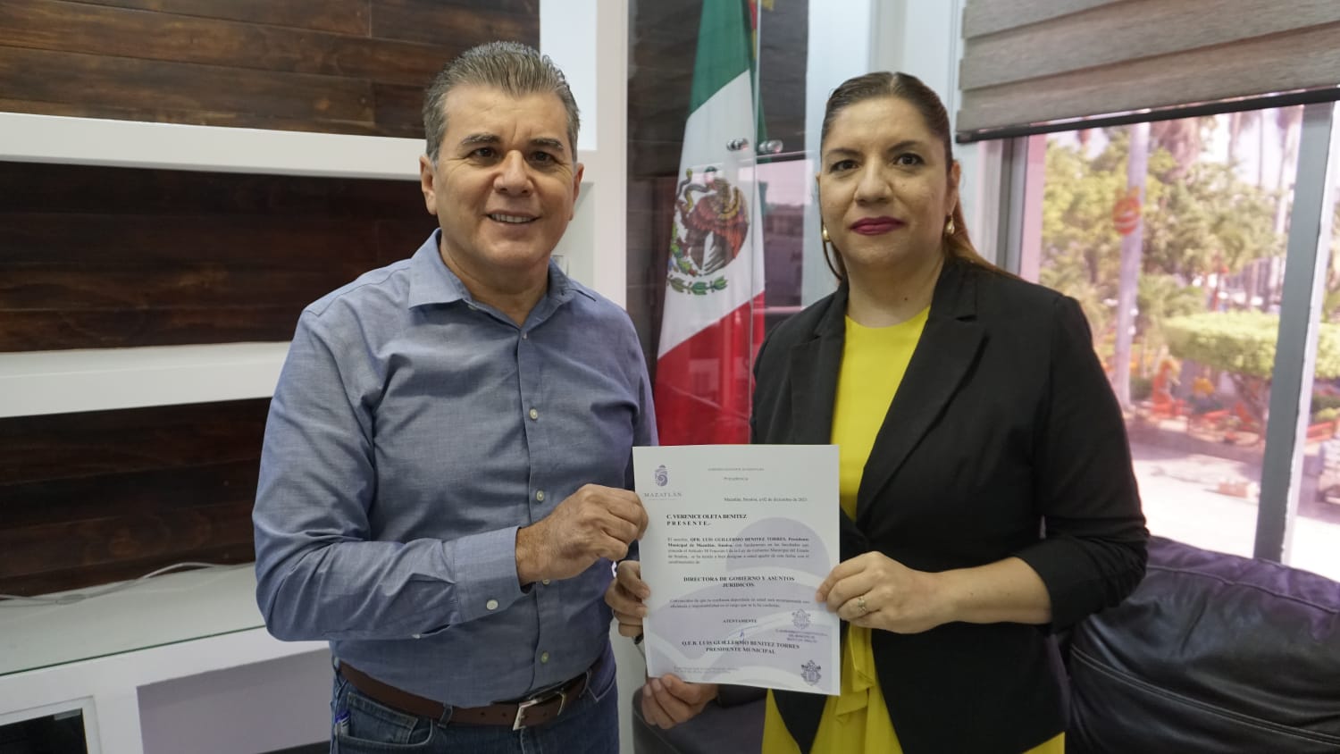 Mazatlán.- El Secretario del Ayuntamiento, Édgar González Zataráin, entregó nombramiento a Verenice Oleta Benítez como Directora de Asuntos Jurídicos.