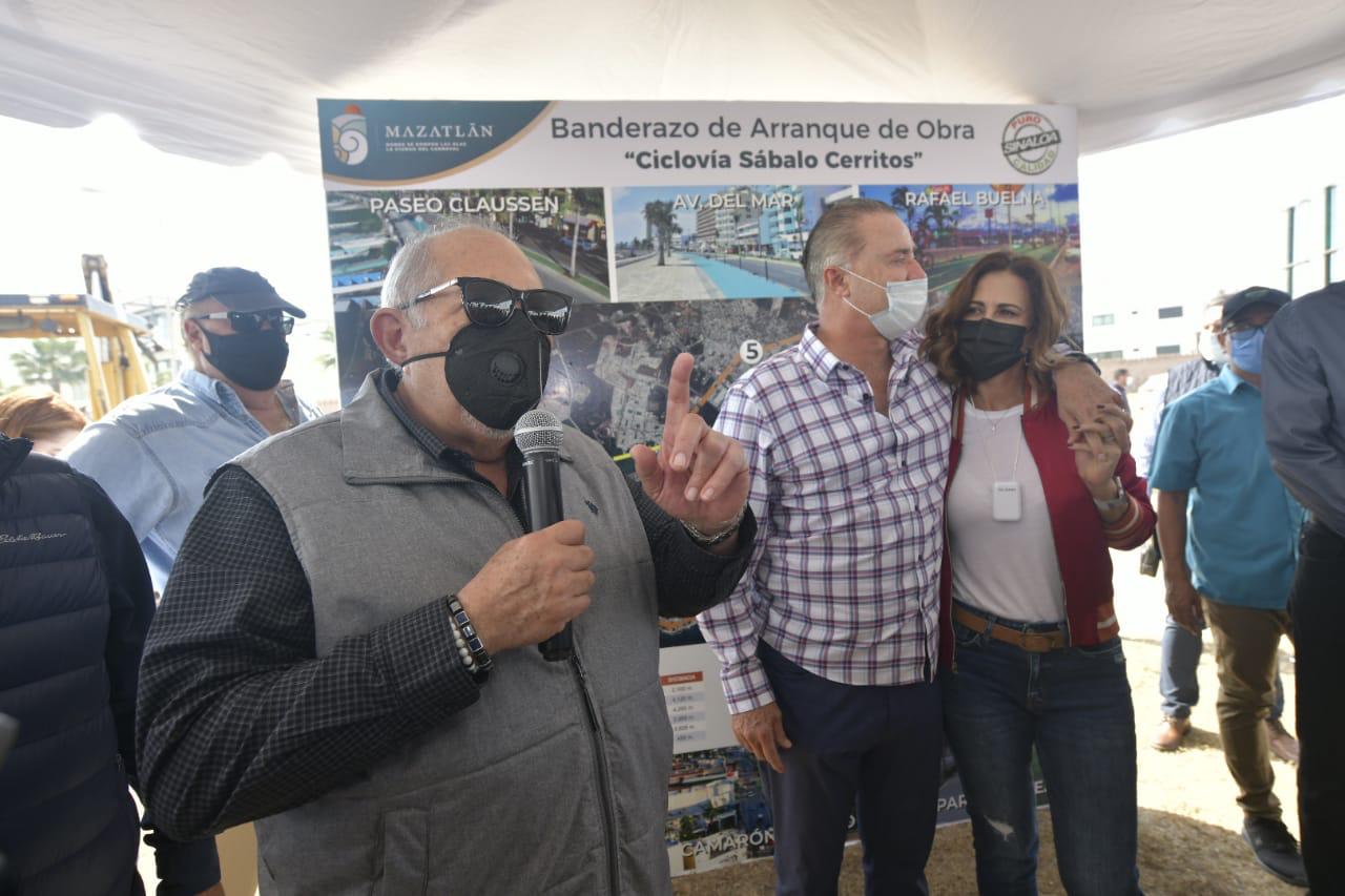 Mazatlán.- Con una inversión de 23.5 millones de pesos, el Gobernador del Estado, Quirino Ordaz Coppel, y el Alcalde de Mazatlán, Luis Guillermo Benitez Torres, dieron el banderazo de arranque para la construcción de la ciclovía Sábalo-Cerritos.
