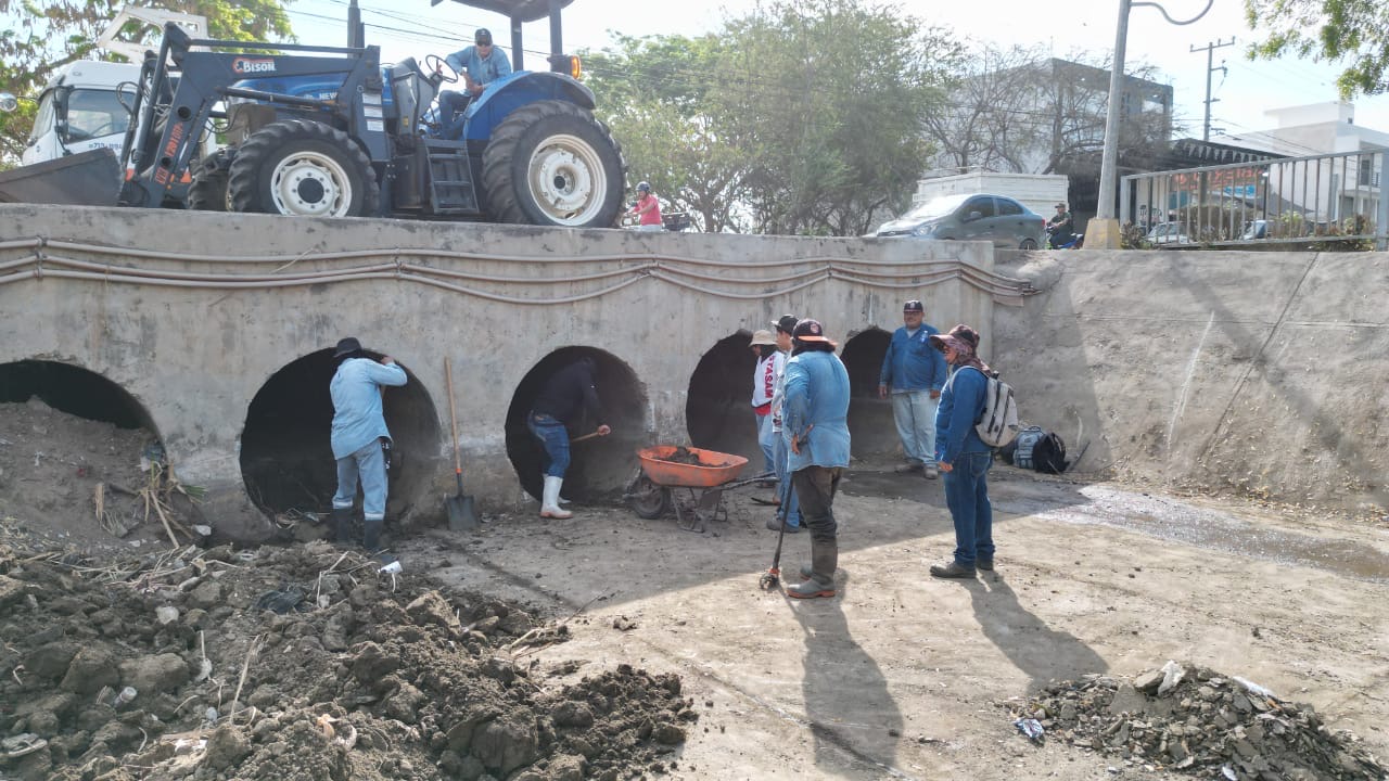 Mazatlán, Sinaloa, 13 de mayo de 2025.- La Dirección de Obras Públicas del Gobierno Municipal, a través del Programa de Limpieza de Canales Pluviales, realiza de manera simultánea los trabajos de desazolve en los tramos de canales pluviales que cruzan por las colonias Jaripillo, Santa Rosa, Presas del Valle, Bosques del Arroyo y en la sindicatura de Villa Unión, previo a la temporada de lluvias.