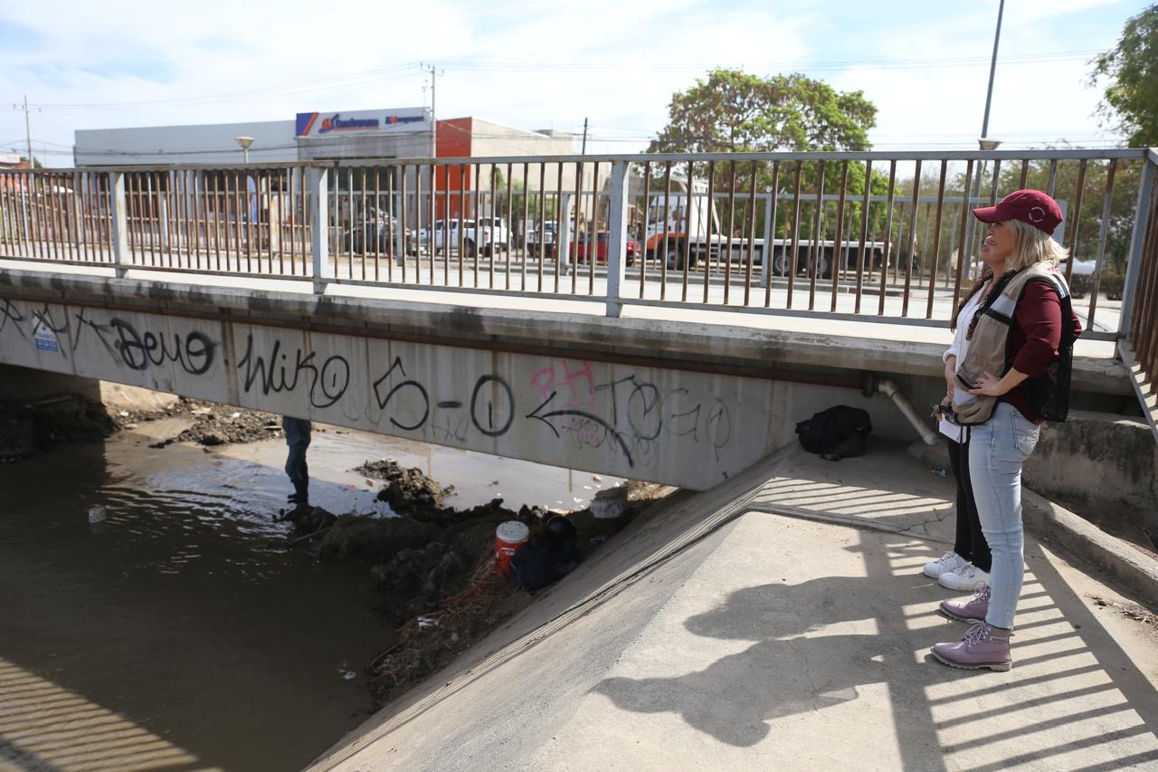 La Presidenta de Mazatlán, Estrella Palacios Domínguez, acompañada de la Directora de Obras Públicas, Cristina Ovalle Acosta, y la Directora de Servicios Públicos, Karla Angélica Camacho Guzmán, llevó a cabo un recorrido de supervisión para verificar los trabajos de limpieza y desazolve que están en proceso en el canal de la colonia Jaripillo, labor que se realiza para mitigar posibles inundaciones en zonas bajas de la ciudad.