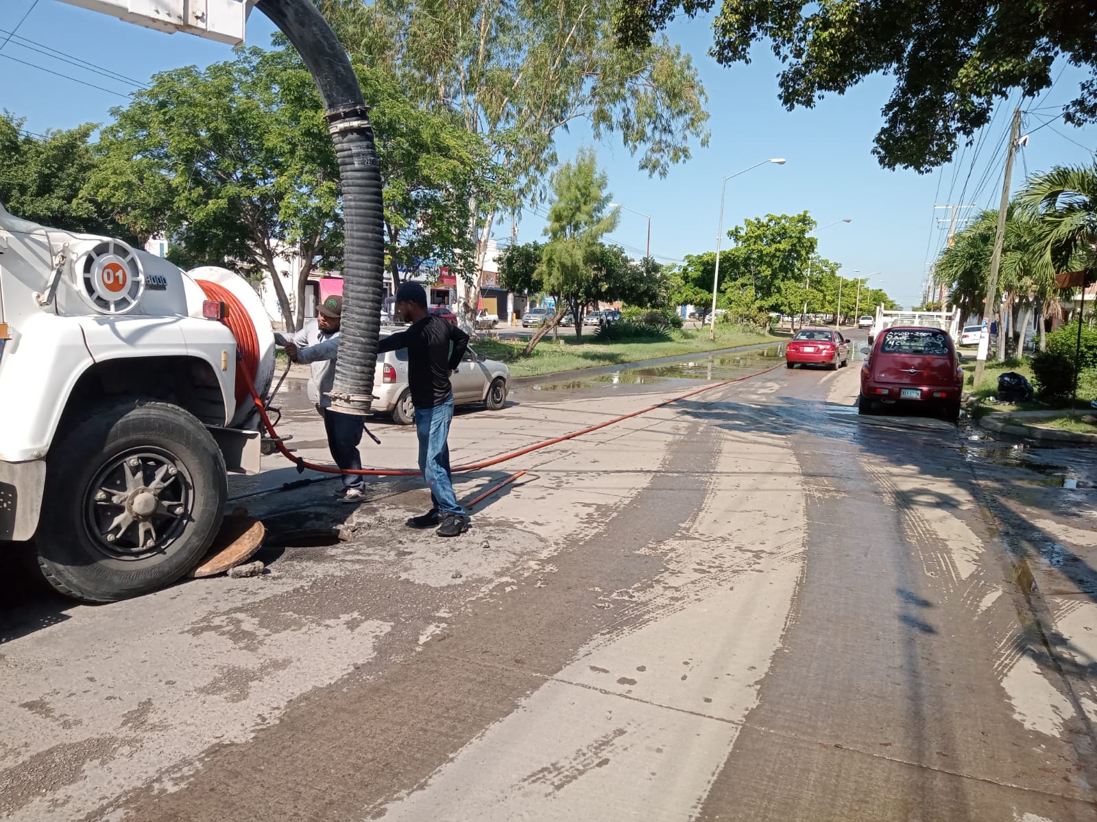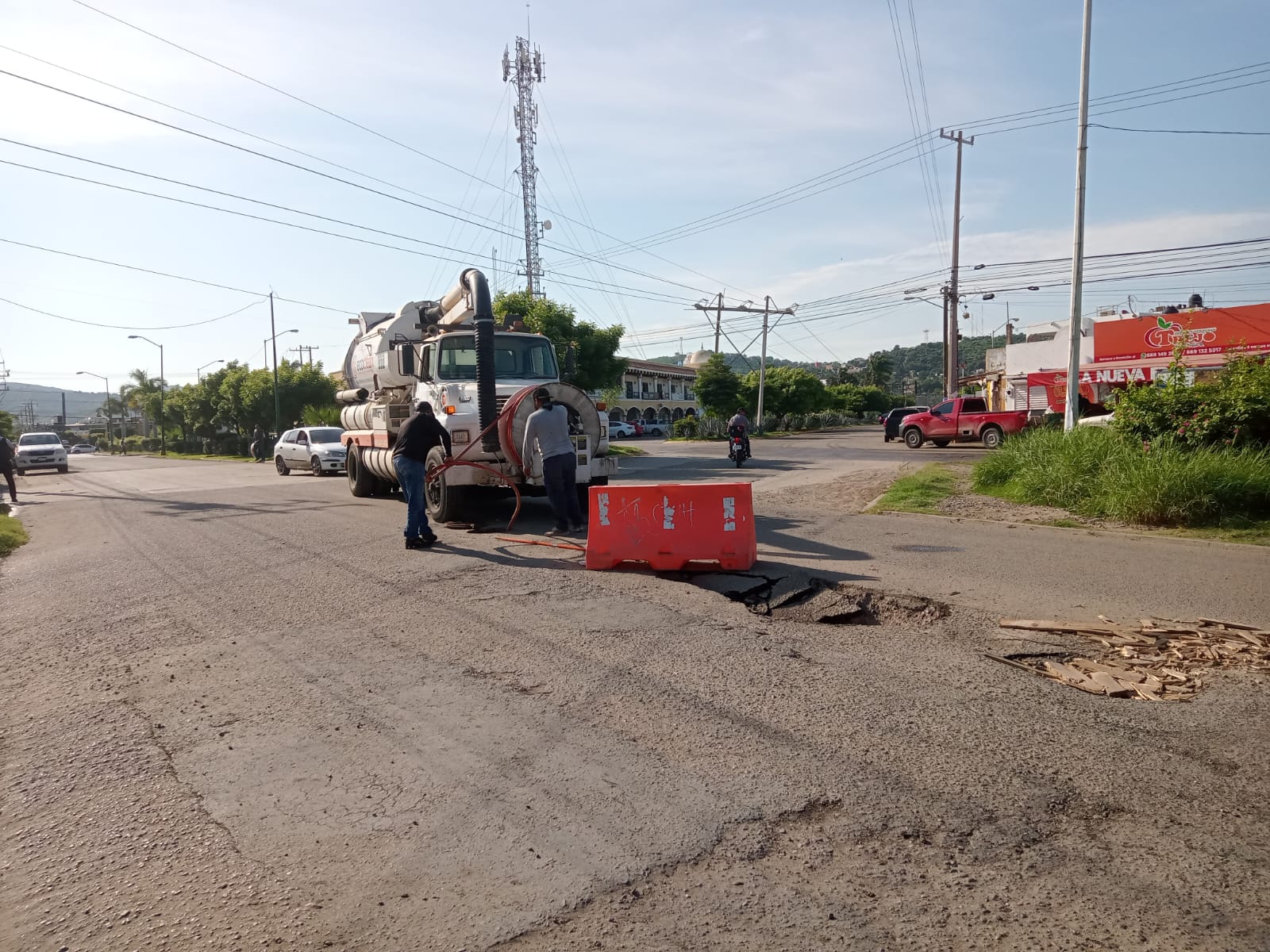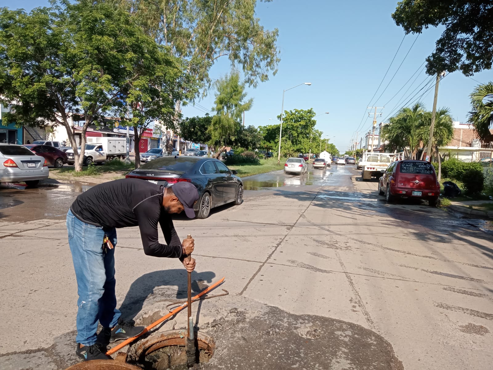 Mazatlán, Sinaloa, a 14 de septiembre de 2023.- Ante los reportes de un presunto socavón en la Avenida Jacarandas y de varios escurrimientos en los pozos de visita de esta vialidad, desde temprana hora del día, personal del Distrito Valles del Ejido de la Gerencia de Operaciones estuvo trabajando intensamente en el sector de San Joaquín para atender la situación.