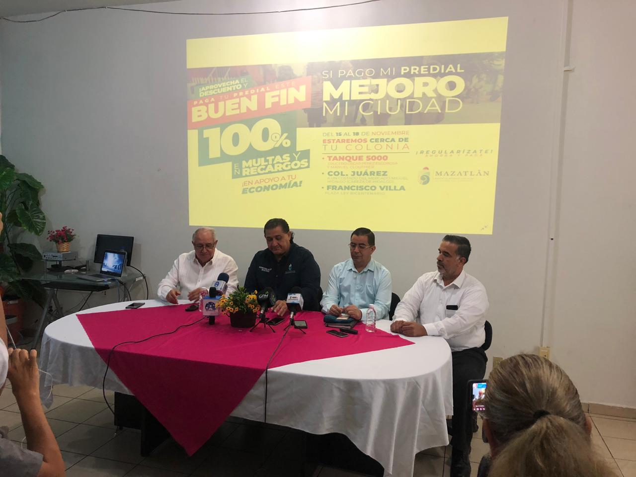 El Director de Comunicación Social, Jorge Contreras Núñez, acompañado del Tesorero Municipal, Javier Alarcón Lizárraga; Javier Enríquez, Director de Ingresos y Alejandro Tiznado Director de Informática del ayuntamiento de Mazatlán extienden la invitación a la ciudadanía para que aprovechen los descuentos en pago de Predial este el fin de semana más barato del año.