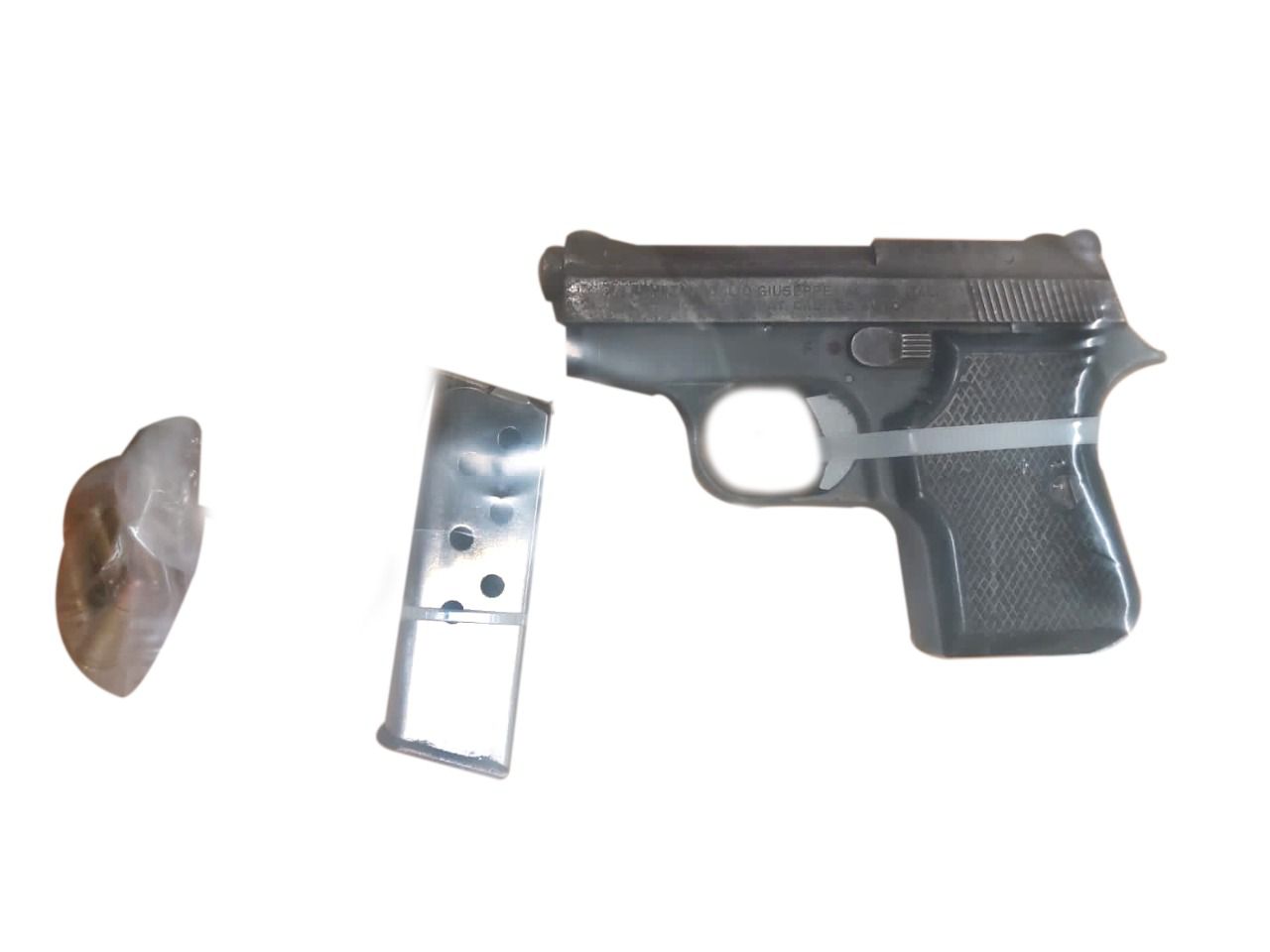 Al realizarle una inspección, los municipales le encontraron en la bolsa del pantalón una pistola calibre 22, con su respectivo cargador abastecido de cinco cartuchos útiles, por lo que quedó formalmente detenido por el delito de lesiones mediante el uso de arma de fuego y fue turnado a la autoridad correspondiente para que defina su situación jurídica.