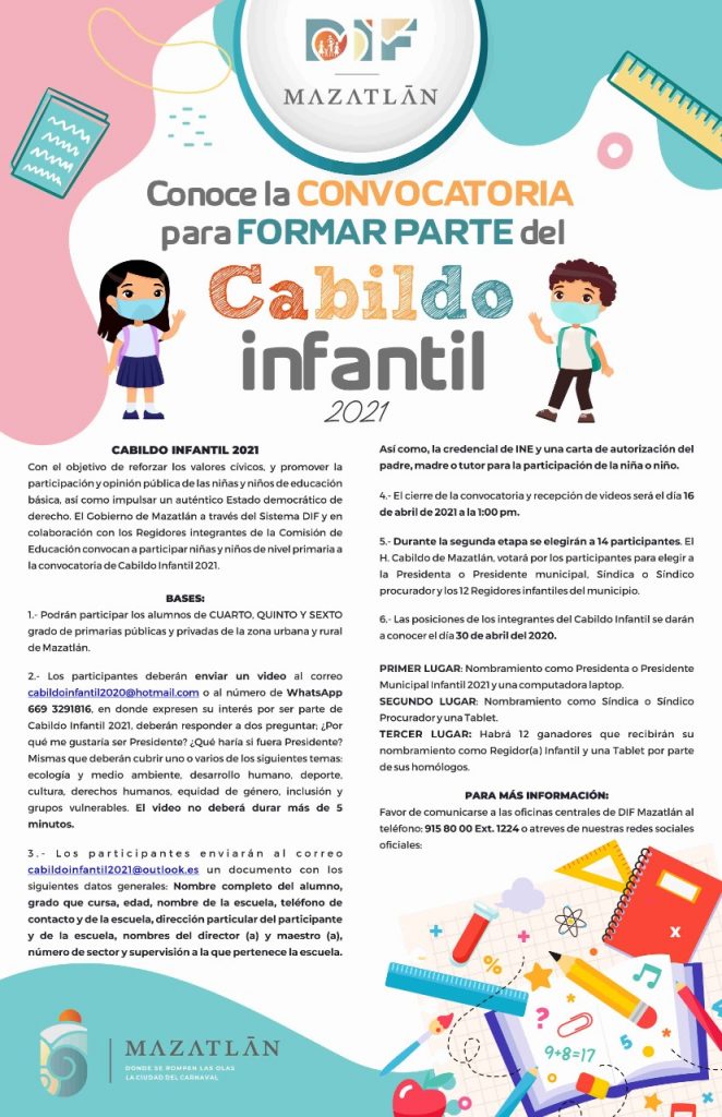 Mazatlán.- El Gobierno de Mazatlán que encabeza el Alcalde Químico Luis Guillermo Benítez Torres, a través de DIF Mazatlán que preside la Señora Gabriela Peña Chico, lanza la convocatoria Cabildo Infantil 2021, donde se busca a 14 niñas y niños estudiantes de cuarto, quinto y sexto de primaria.