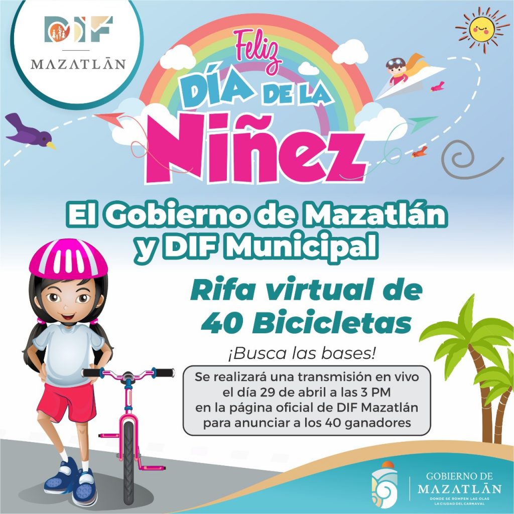 Mazatlán.- El Gobierno de Mazatlán que encabeza el Alcalde Químico Luis Guillermo Benítez Torres, a través de DIF Mazatlán que preside la Señora Gabriela Peña Chico, realizará una rifa virtual de 40 bicicletas que se entregarán casa por casa el jueves 30 de abril, en conmemoración al Día de la Niñez.