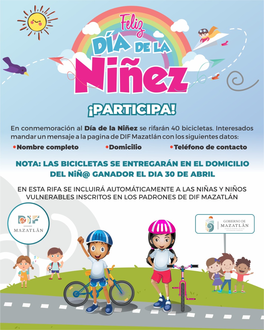 Mazatlán.- El Gobierno de Mazatlán que encabeza el Alcalde Químico Luis Guillermo Benítez Torres, a través de DIF Mazatlán que preside la Señora Gabriela Peña Chico, realizará una rifa virtual de 40 bicicletas que se entregarán casa por casa el jueves 30 de abril, en conmemoración al Día de la Niñez.