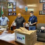 Mazatlán.- El Químico Benitez Torres recibió en su despacho de Presidencia a directivos de las Farmacias Yza+, quienes hicieron un donativo de 200 caretas de protección al Gobierno Municipal.