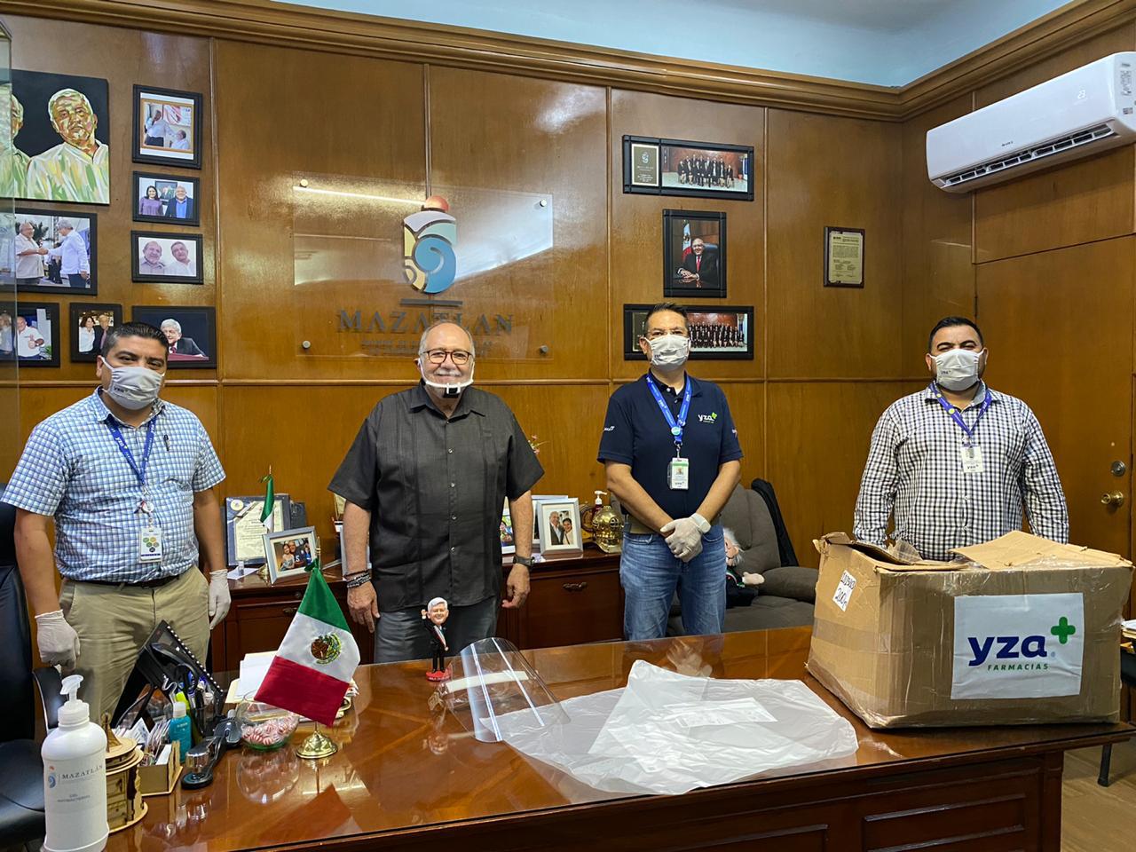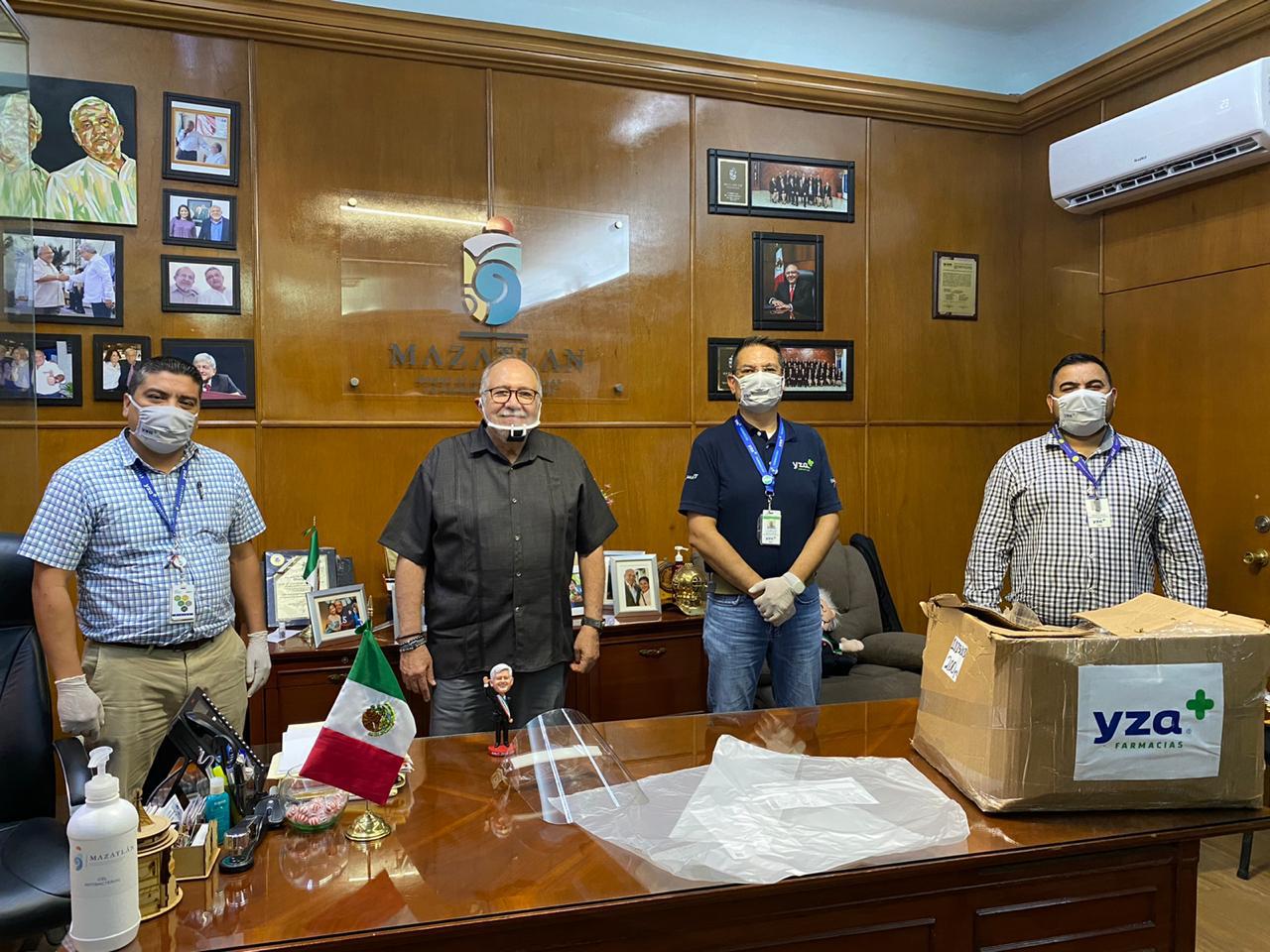 Mazatlán.- El Químico Benitez Torres recibió en su despacho de Presidencia a directivos de las Farmacias Yza+, quienes hicieron un donativo de 200 caretas de protección al Gobierno Municipal.