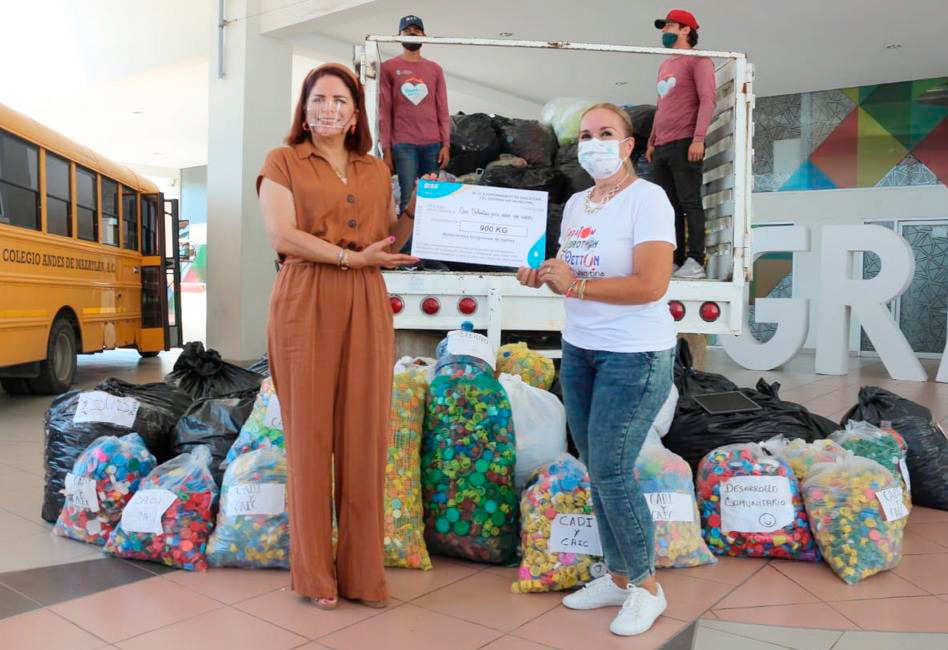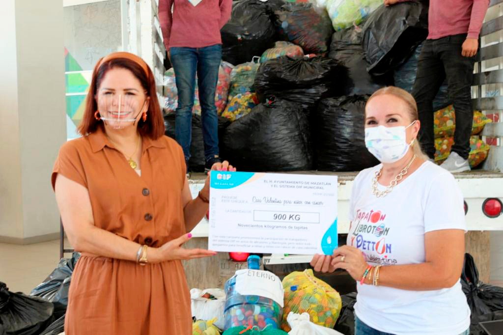 Mazatlán.- Por iniciativa de la Presidenta de DIF Mazatlán, Gabriela Peña Chico, se realizó una colecta de tapitas de plástico entre el personal de las direcciones y coordinaciones de la paramunicipal recolectando un total 900 kilos que este miércoles fueron donados a la Fundación Casa Valentina IAP.