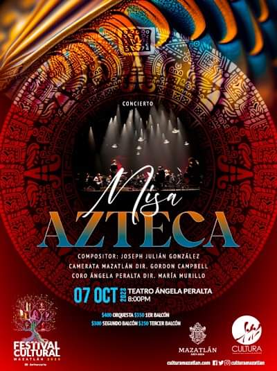 Javier Arcadia invitó al público a asistir a «Misa Azteca» con la actuación de la Camerata Mazatlán, el Coro Ángela Peralta, el Ballet Folklórico de Cultura, y los solistas Eduardo Tapia (tenor), Wendy García (soprano) y Rosa Ferreiro (mezzosoprano), bajo la dirección del maestro Gordon Campbell.