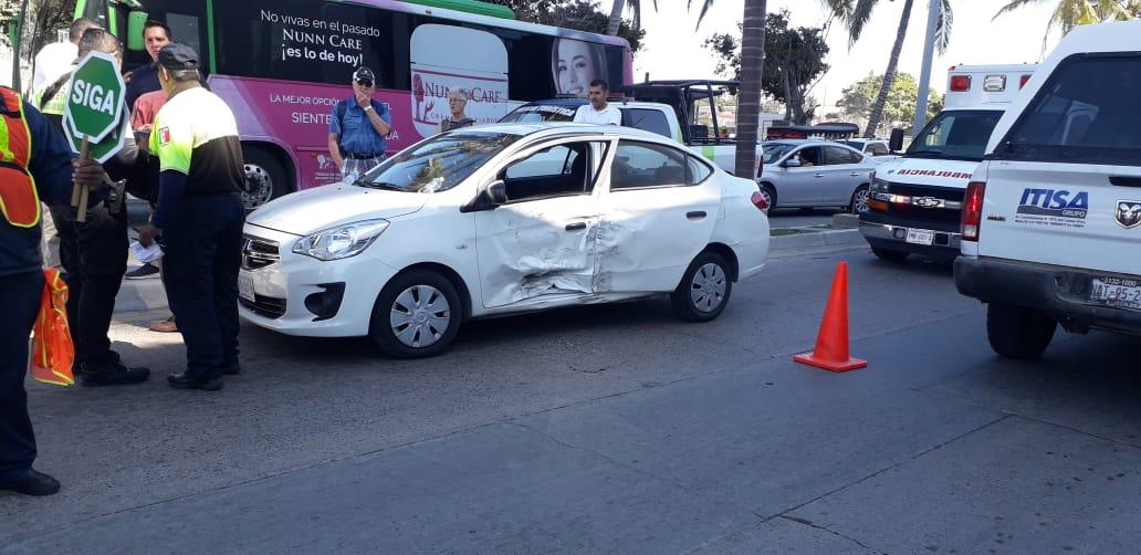 Mazatlán, SInaloa.- Dos conductores, un hombre y una mujer, resultaron lesionados al colisionar las unidades en las que viajaban, en plena zona turística.