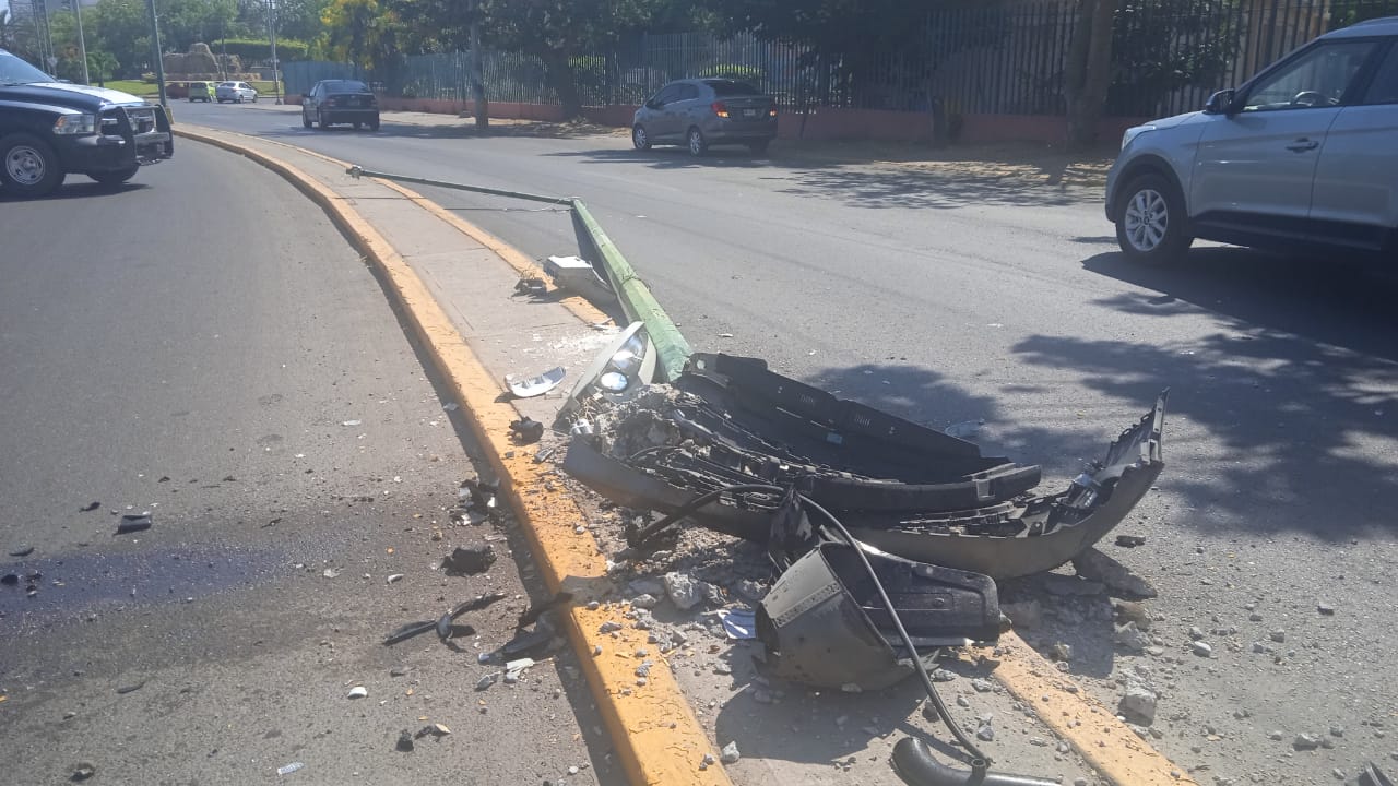 Se dijo que el automóvil KIA gris, se estrelló contra una luminaria del camellón central, la cual derribó, luego de que fuera impactado por otro carro, mismo que se retiró del sitio, según afectado.