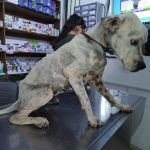 El perro macho, al ser revisado por el veterinario de la Dependencia Municipal, se encontró en evidente estado de deshidratación, infestado de garrapatas y pulgas.