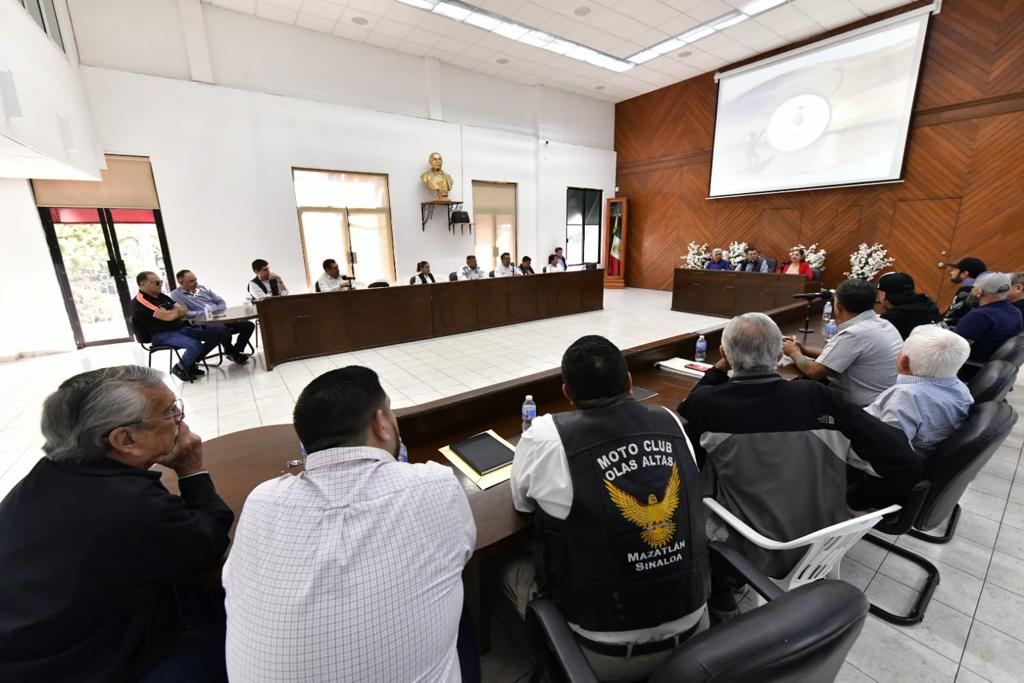 Mazatlán, Sinaloa, 29 de noviembre de 2022.- El Alcalde de Mazatlán, Edgar González Zatarain, la Oficial Mayor, Verenice Oleta Benítez y el Secretario del Ayuntamiento, Rafael Mendoza, sostuvieron un favorable encuentro con el Consejo Consultivo de la Semana Internacional de la Moto la mañana de este martes, en la cual, el Primer Edil aseguró que el Gobierno Municipal dará el apoyo necesario a la organización para la realización del evento en el 2023.