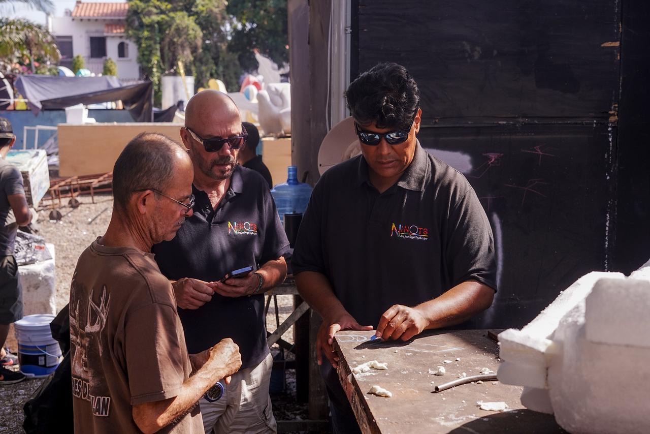 Además de las carrozas, la mancuerna Trujillo-Boronat recibió la encomienda de dar vida a dos monigotes monumentales que superan los 10 metros de altura, fusionando el moldeado estilizado con el clásico arte del alambrón.