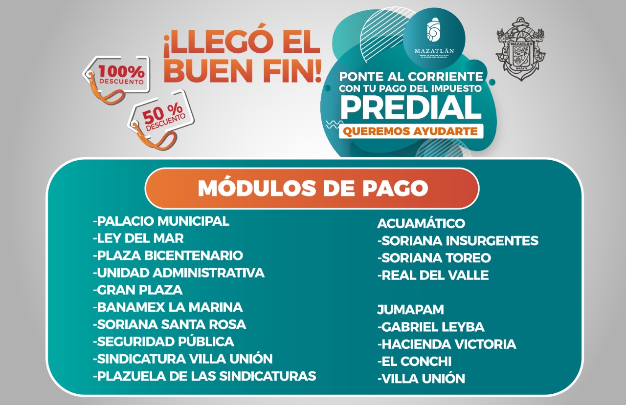 El pago de estos impuestos con descuentos se puede llevar a cabo en el Palacio Municipal, en las ventanillas de pago de la Dirección de Ingresos o en los módulos de JUMAPAM establecidos en Plaza Del Mar, Soriana Toreo, Unidad Administrativa, Gabriel Leyva, Gran Plaza, Aquamático Real del Valle, Banamex Marina, Aquamático Soriana Insurgentes, JUMAPAM Conchi, Soriana Santa Rosa, JUMAPAM Hacienda Victoria y JUMAPAM Villa Unión.