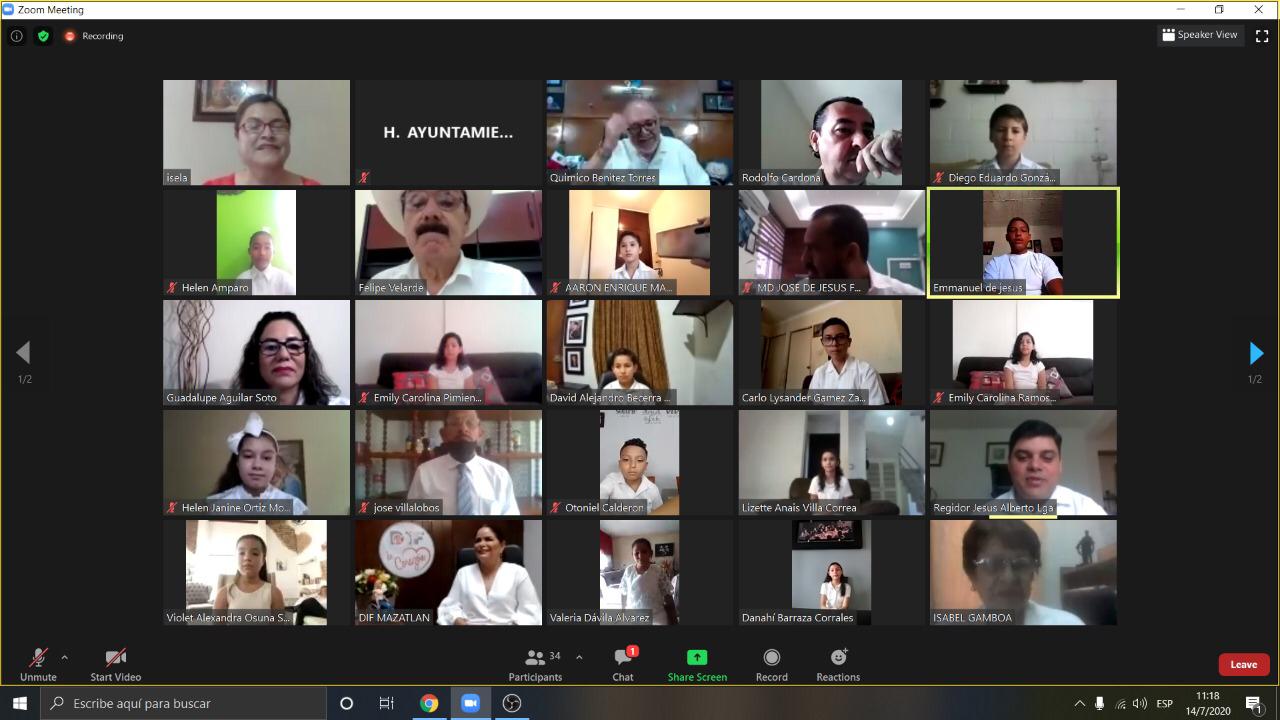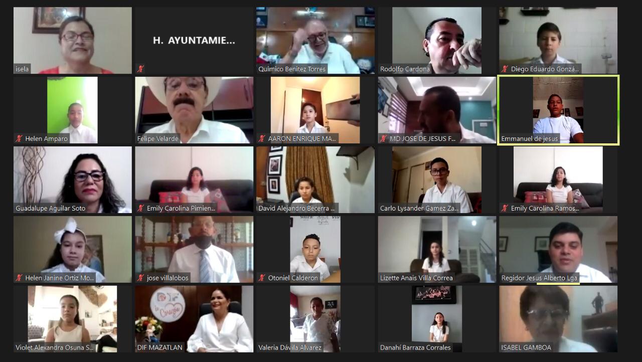 Mazatlán.- De forma virtual se realizó la sesión cabildo encabezada por el Presidente Municipal Químico Benítez Torres y la señora Gabriela Peña Chico, Presidenta del Sistema DIF Mazatlán y el H. Cuerpo de Regidores del Municipio; para dar a conocer los puestos de las niñas y niños que quedaron seleccionados para ser parte de Cabildo Infantil 2020.