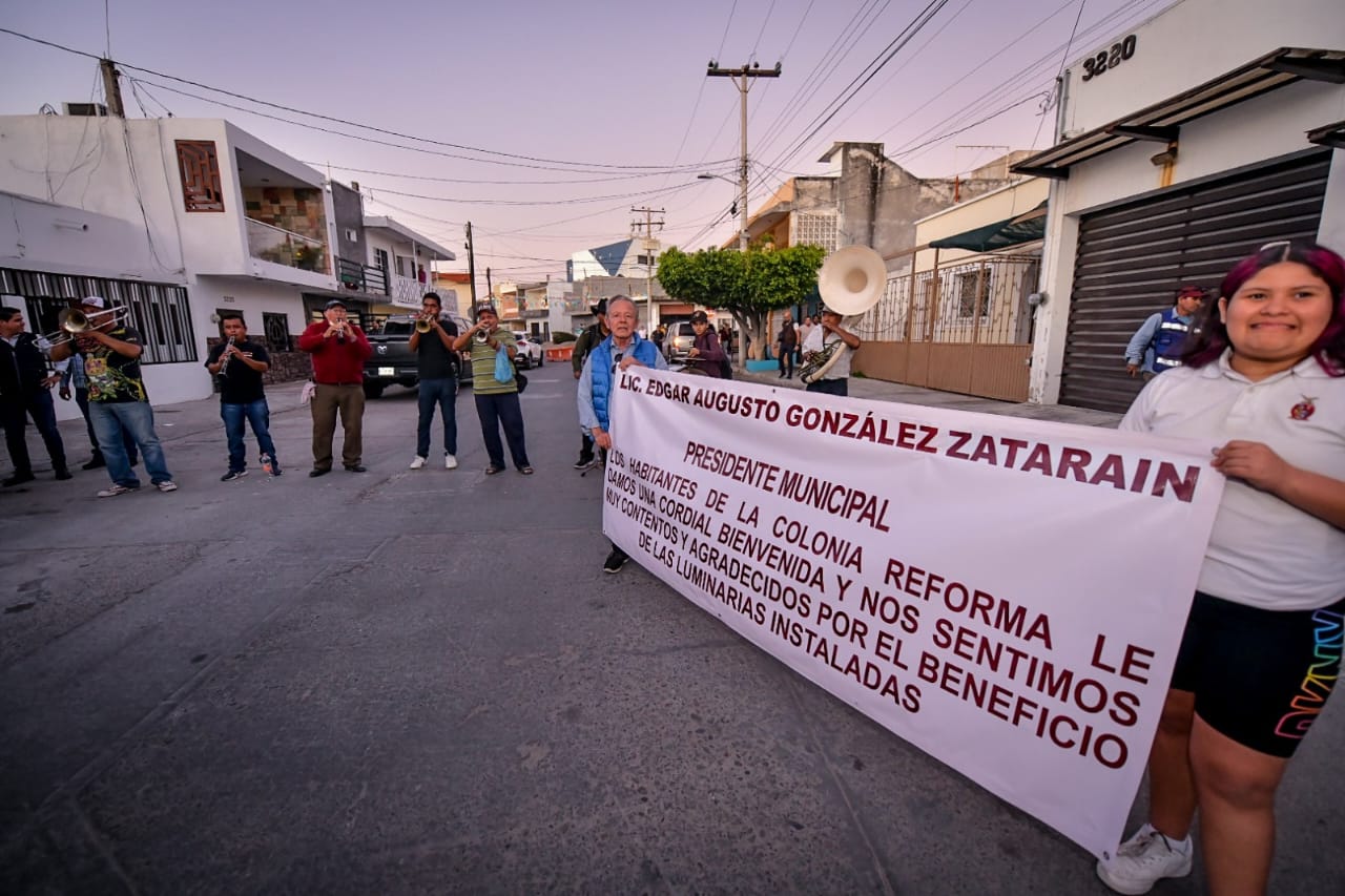 Al acto de encendido de las luminarias led realizado en la calle Segunda Carvajal de la colonia Reforma, asistieron empresarios de la localidad, regidores, funcionarios municipales y familias beneficiadas con esta acción social que, como muestra se agradecimiento, festejaron con música de banda y unos ricos tamales.