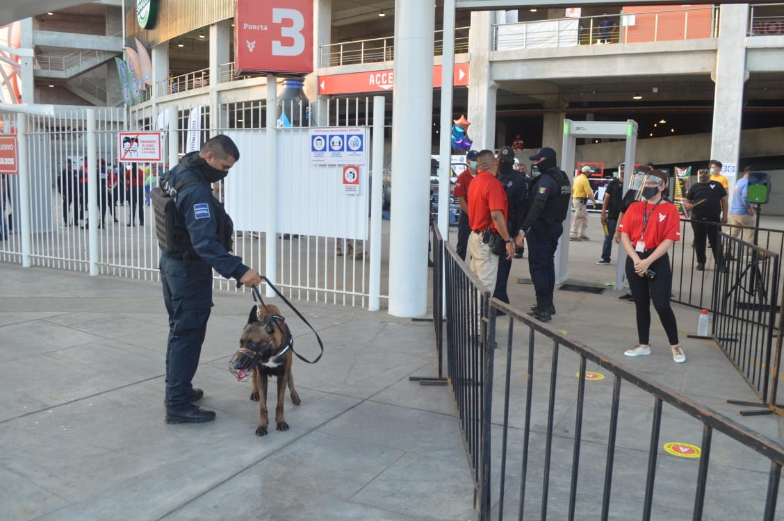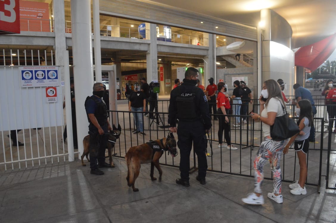 Los vehículos que ingresaron al recinto deportivo fueron sanitizados por la Brigada Municipal de Salud, en tanto que las unidades caninas K9, de la Policía Municipal también participaron en el operativo, que será desplegado en cada partido que se juegue en esta ciudad.
