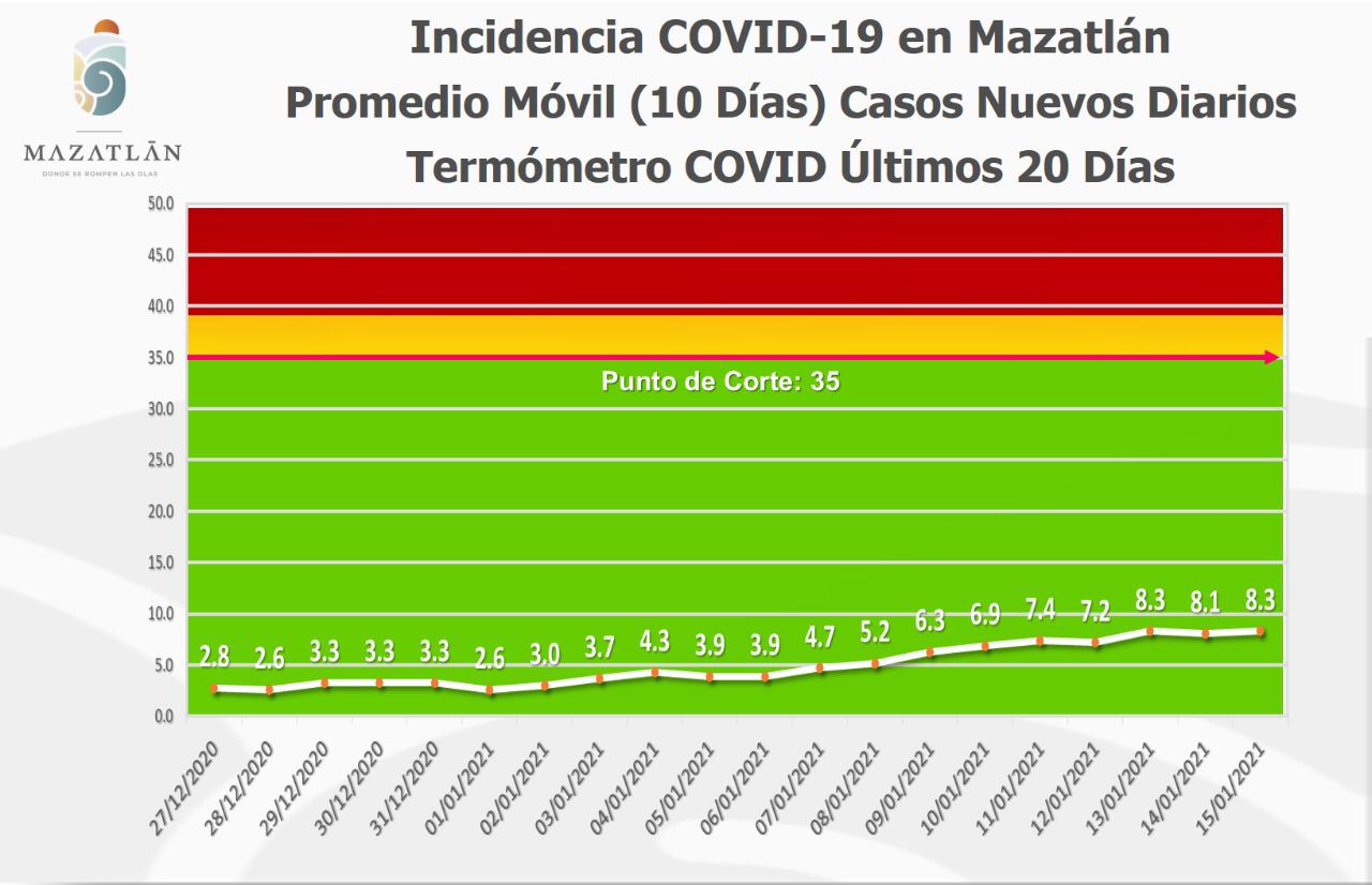 Sobre los sistemas de medición de la pandemia que emplea el Gobierno que encabeza el Alcalde Luis Guillermo Benitez Torres, comentó que el Termómetro de Casos Nuevos Diarios este día se ubicó en 8.3 grados, y se cumplieron ya 102 días en 15 casos, promedio de los últimos 10 días.