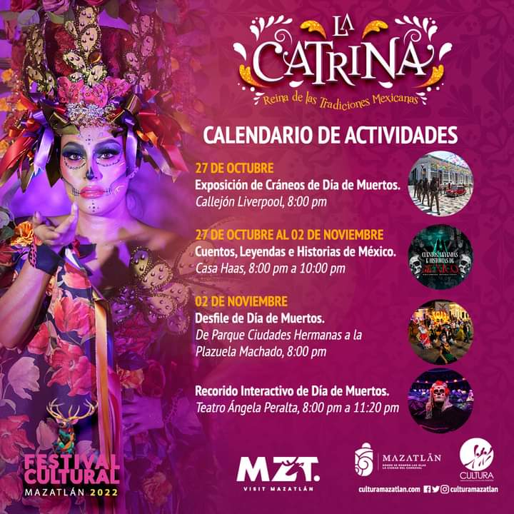 En el puerto el Festival Cultural Mazatlán 2022 presenta “La Catrina, reina de las Tradiciones Mexicanas”, con actividades que iniciaron desde el 27 de Octubre con la exposición de Cráneos de Día de Muertos.
