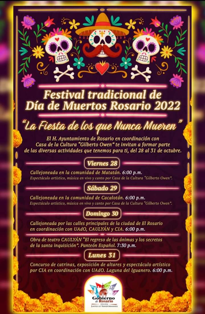 En el Pueblo Mágico de El Rosario se realizará el Festival de Día de Muertos Rosario 2022, “La Fiesta de los Nunca Mueren”, del 28 al 31 de octubre. Este sábado realizará una callejoneada en Cacalotán a partir de las 6:00 de la tarde, donde habrá música en vivo y canto, el domingo 30 se hará en Rosario y concluye el lunes 31 de octubre con un concurso de catrinas, exposición de altares y espectáculo artístico en la Laguna del Iguanero a partir de las 6:00 de la tarde.
