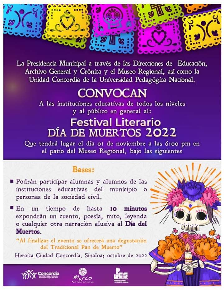El gobierno local también convoca al Festival Literario Día de Muertos 2022 el 1 de Noviembre, a partir de las 6:00 de la tarde en el patio del Museo Regional.