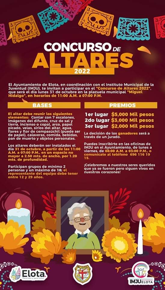 Elota no se queda atrás, con el Concurso de Altares 2022 y convoca a la población a participar en la instalación de altares, y cumplir con requisitos como contar con imágenes, cruz de sal y tierra, incienso o copal, papel picado, velas, sirios, flores de cempasúchil, comida, calaveras y objetos personales del difunto, entre otros.