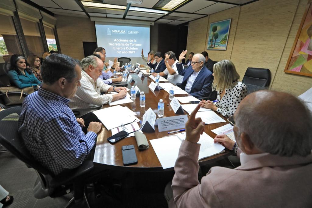 Entre otros temas, durante la reunión se expusieron las acciones de promoción realizadas en el extranjero, los apoyos a municipios en fomento turístico, la capacitación a personal vinculado al sector turístico, los incentivos al turismo de reuniones, pueblos señoriales y pueblos mágicos (Cosalá, Rosario, El Fuerte y Mocorito), así como las acciones de promoción en ferias, exposiciones y eventos turísticos, como la Feria Internacional de Turismo, el Tianguis Turístico de México, la Feria de Nayarit, la Feria Nacional de Durango, el Tianguis de Pueblos Mágicos y el Gran Premio de México de Fórmula 1.
