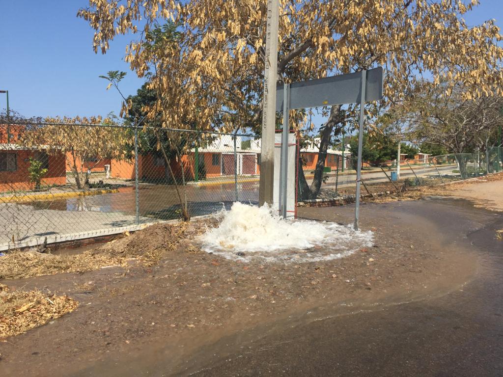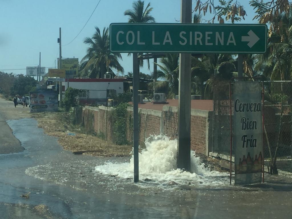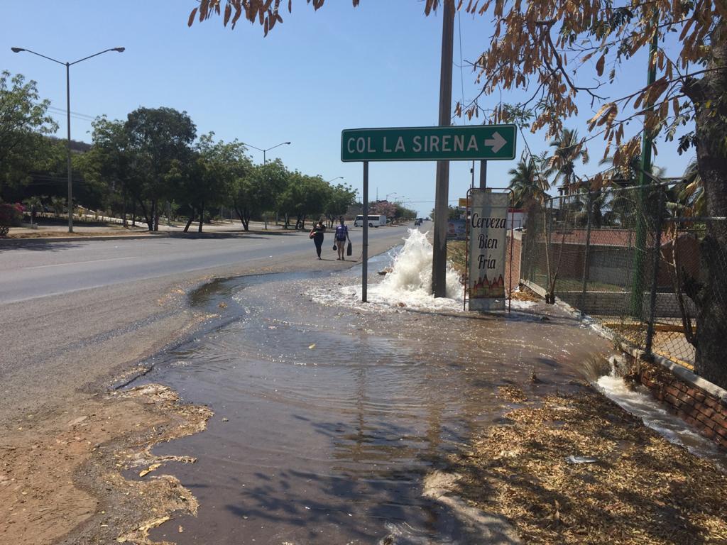 Mazatlán, Sinaloa.- Miles de litros de agua se desperdicia después de que una compañía telefónica excavara para instalar un poste, dañando una de las principales tuberías de la Jumapam.