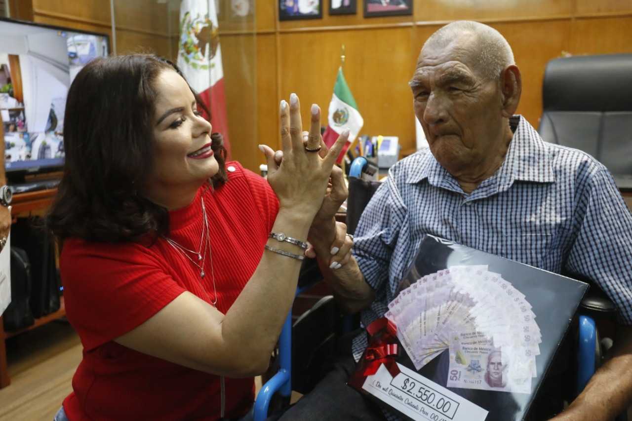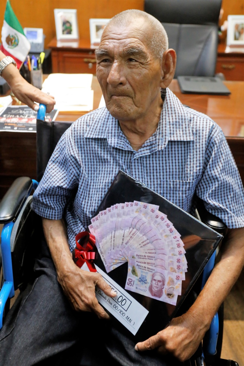 Mazatlán.- El popular “Buto”, personaje muy querido por la ciudadanía mazatleca, recibió este jueves la donación de dos mil quinientos cincuenta pesos por parte del Químico Luis Guillermo Benítez Torres, Presidente Municipal de Mazatlán, quién se comprometió a entregarle de manera periódica el apoyo de su pensión universal.