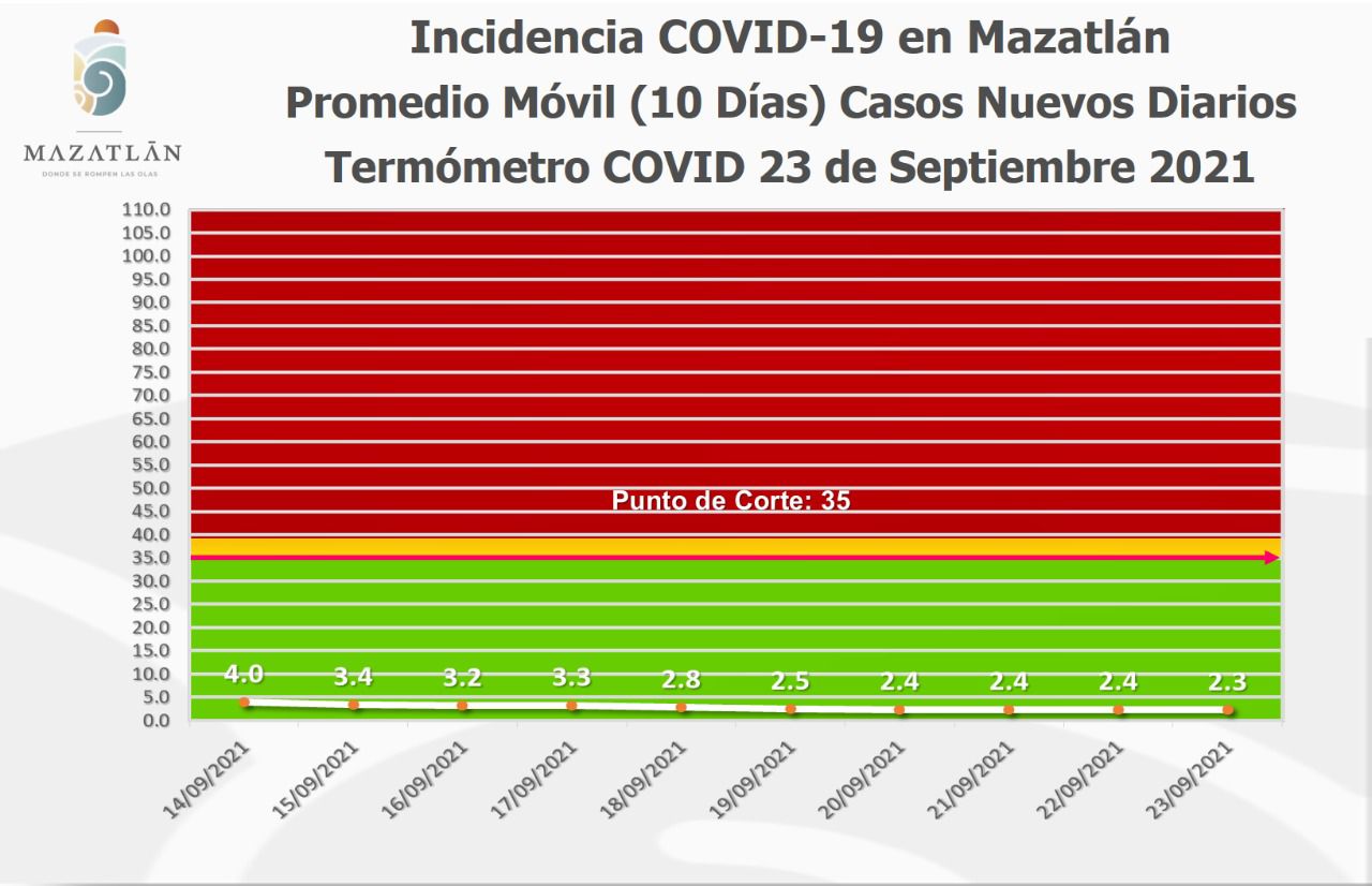 Con 64 enfermos del virus Sars-Cov-2 este viernes, Mazatlán se encuentra en color verde del Semáforo Epidemiológico Estatal y del Termómetro Covid del Ayuntamiento, que se ubica en los 2.3 grados, agregó el funcionario.