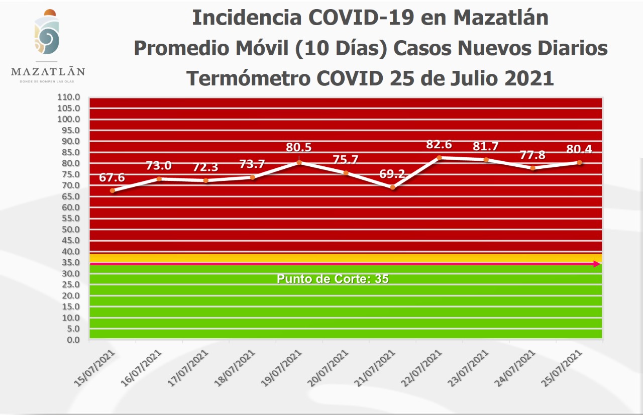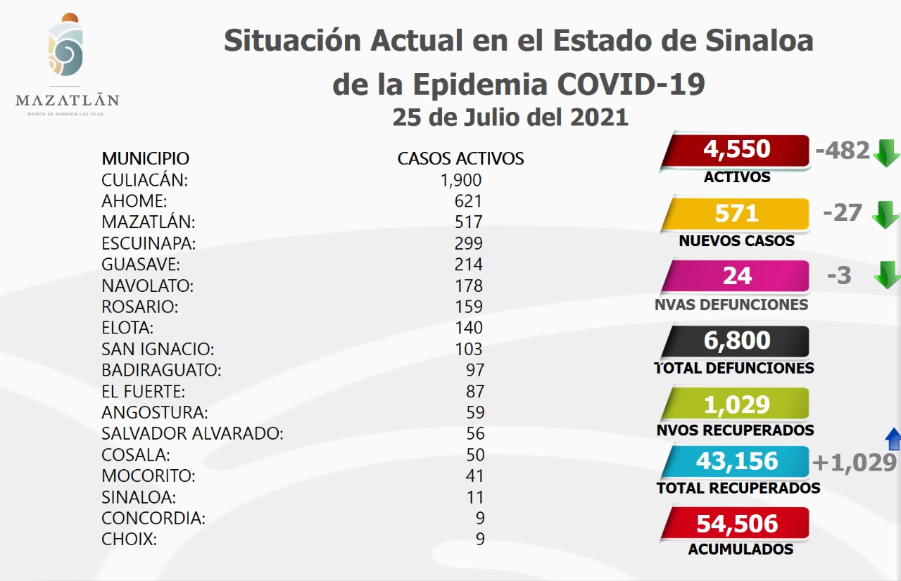 Con esta cifra, Mazatlán se mantiene en color rojo de Semáforo Epidemiológico Estatal y es tercero en Sinaloa con casos activos, por debajo de los municipios de Culiacán y Ahome, que hoy tienen mil 900 y 621 respectivamente.