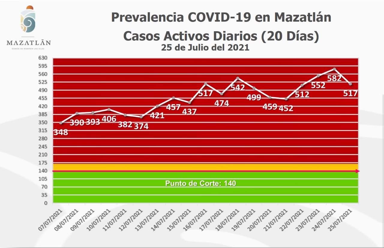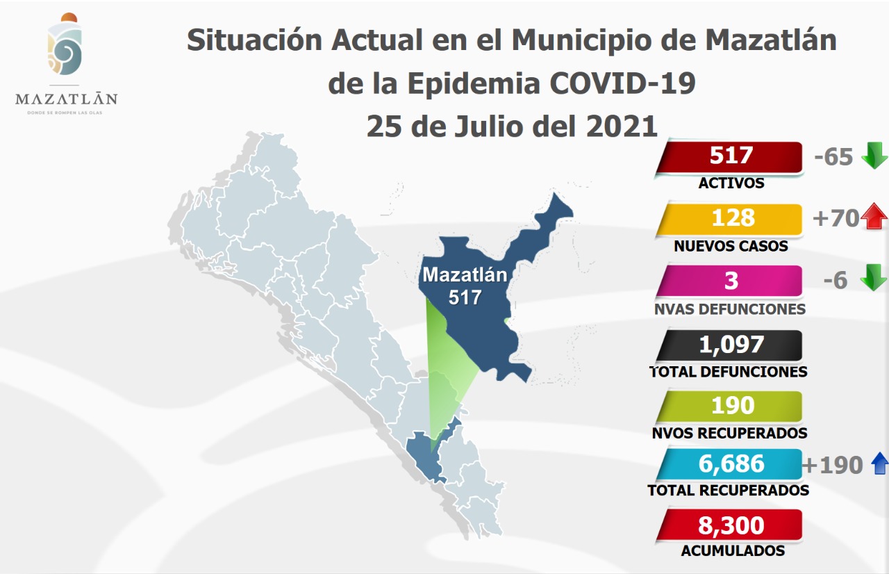 Mazatlán.- Este lunes, el puerto amaneció con 517 casos activos de Covid-19, por lo que las autoridades municipales continúan reforzando las acciones preventivas para mitigar y contener los contagios con el virus Sars-Cov-2 y exhortan a la población a la quedarse en casa.