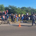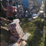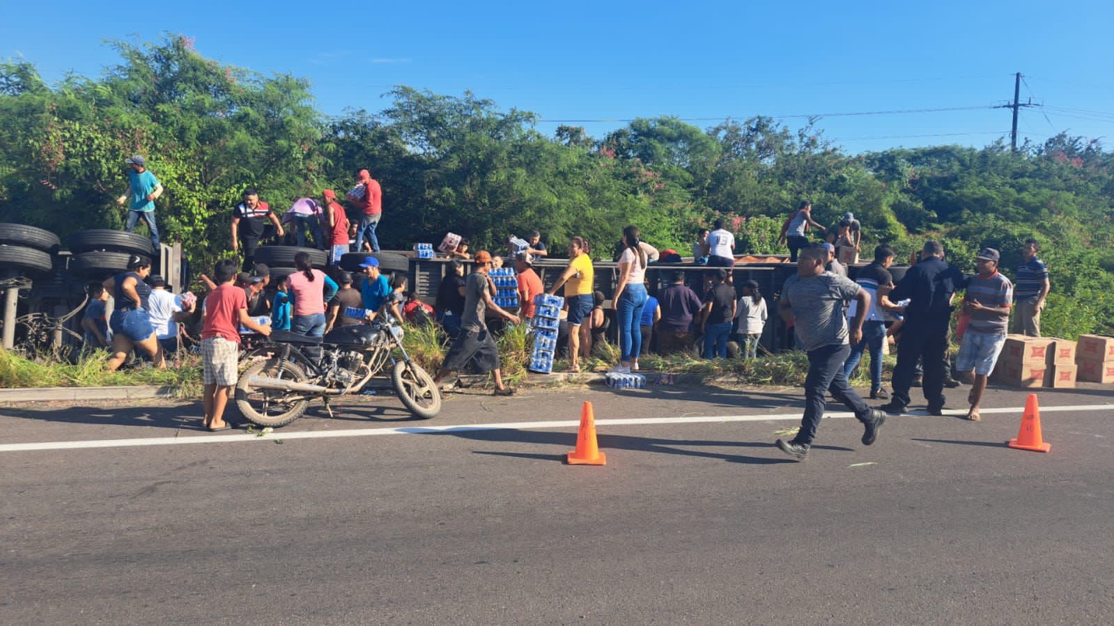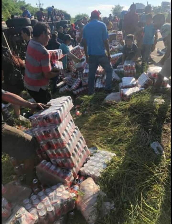 Mazatlán, Sinaloa.- Familias completas son las que llegaron a la rapiña, luego de que un tráiler cargado con cerveza, volcara a la salida sur de Villa Unión.