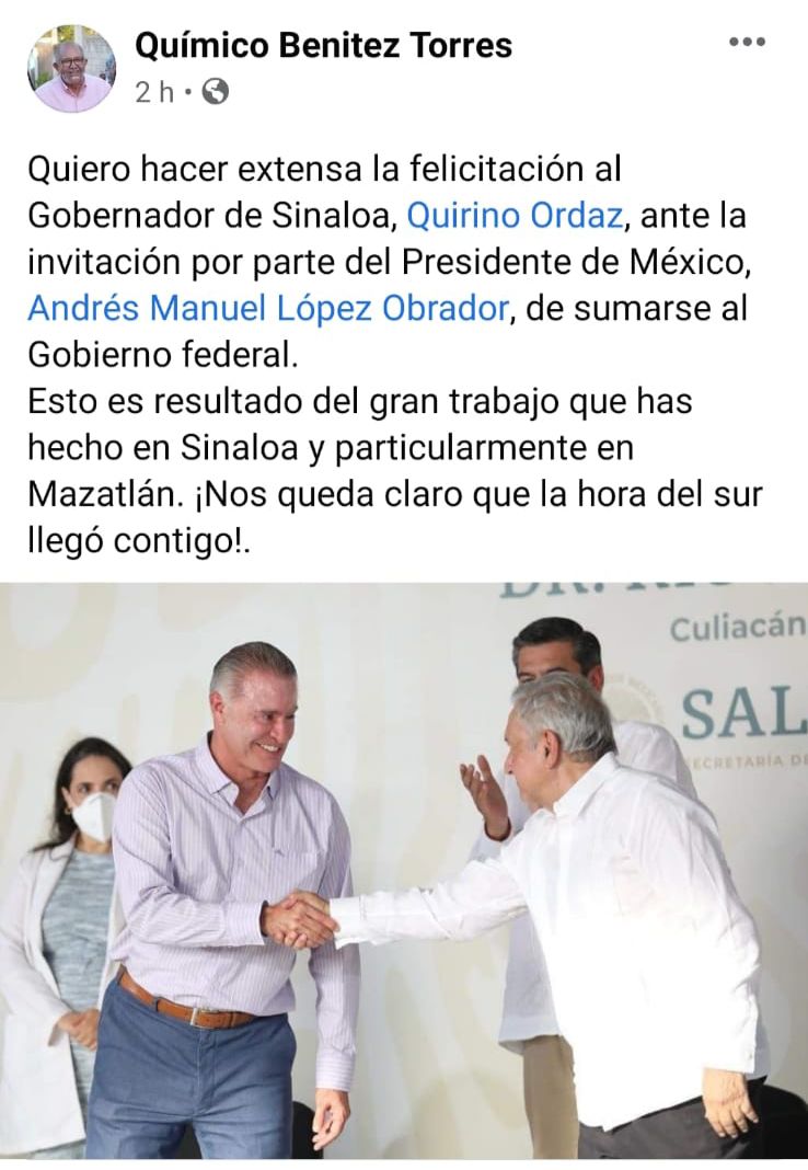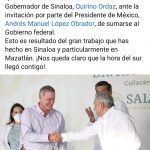 En un mensaje a través de sus redes sociales, el Presidente Municipal manifestó su felicitación al gobernador, acompañándola con una imagen de Quirino Ordaz Coppel Saludando a López Obrador en el evento de supervisión del nuevo Hospital Pediátrico, que ambos encabezaron este viernes en la ciudad de Culiacán.